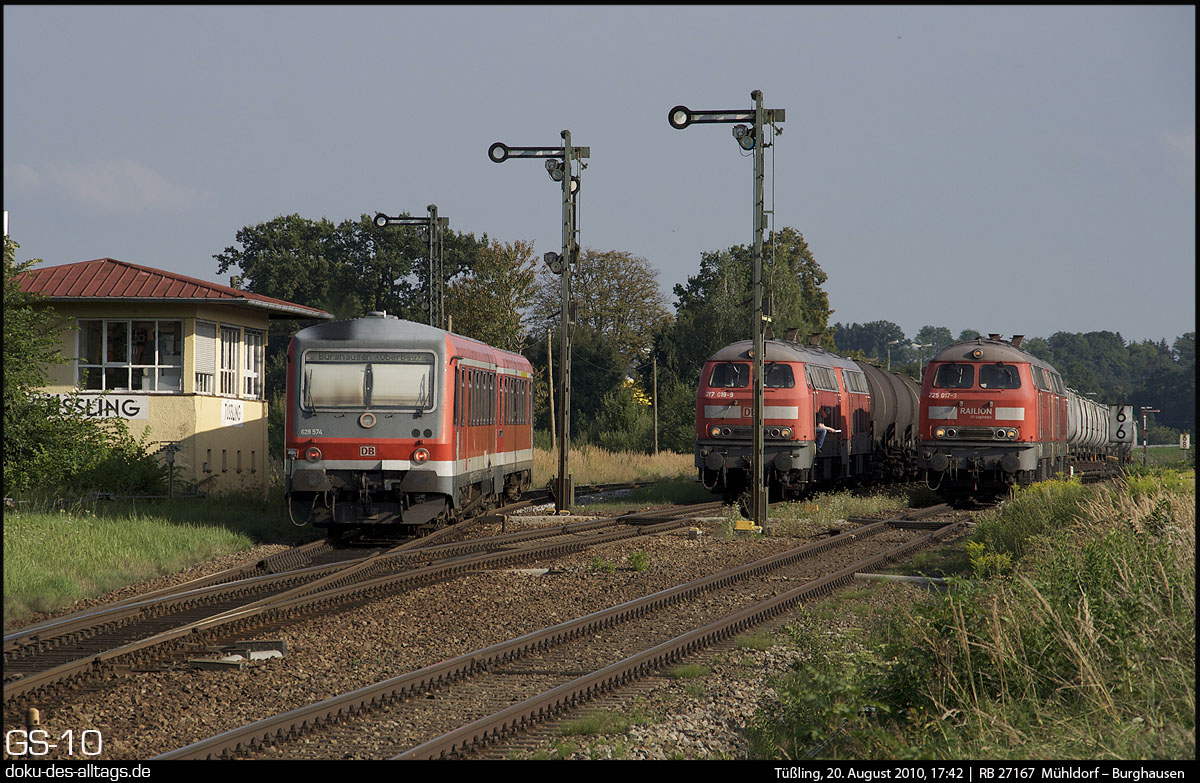 | 11.) 628 574 als Regionalbahn nach Burghausen bei der Einfahrt. 5 Minuten darauf folgt noch die RB 27093 nach Salzburg. | ||||||||||||||