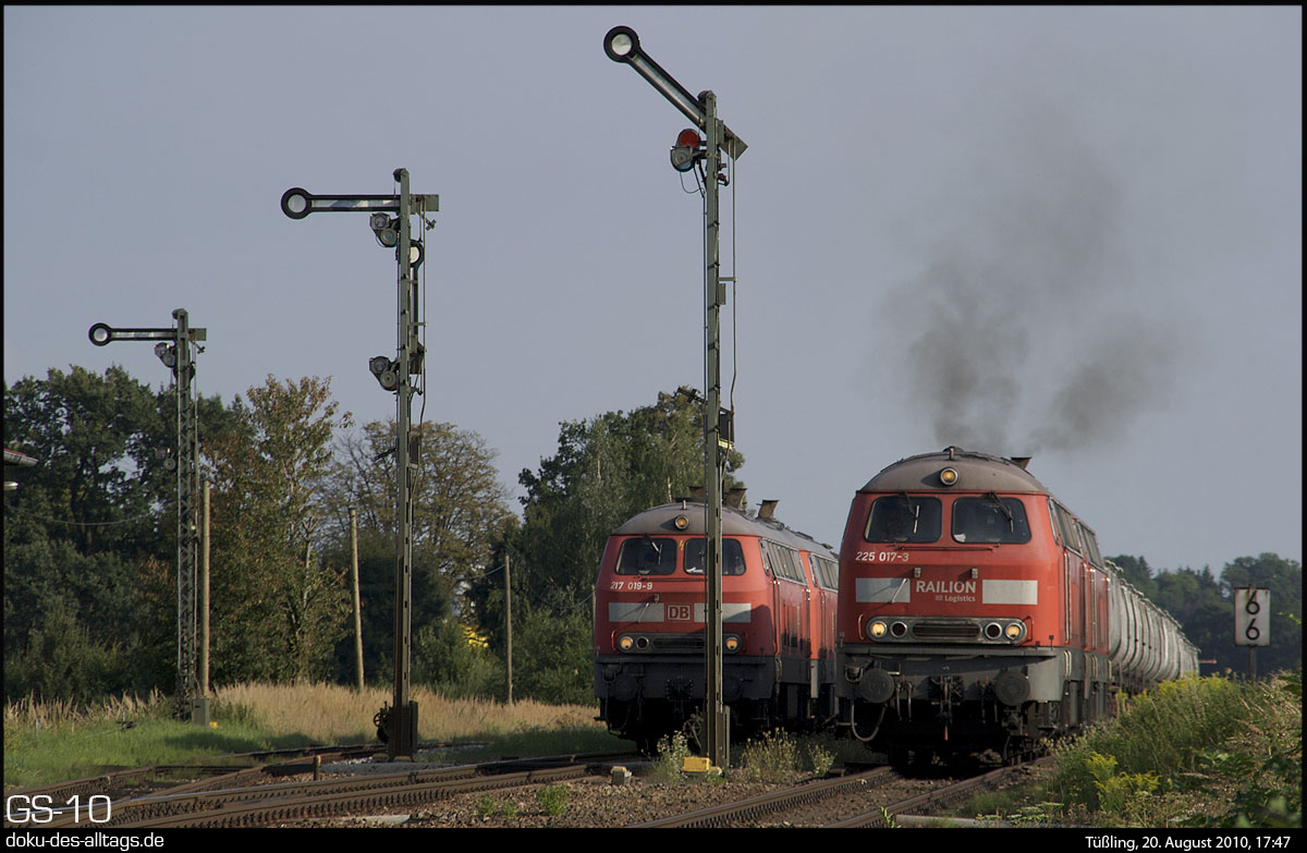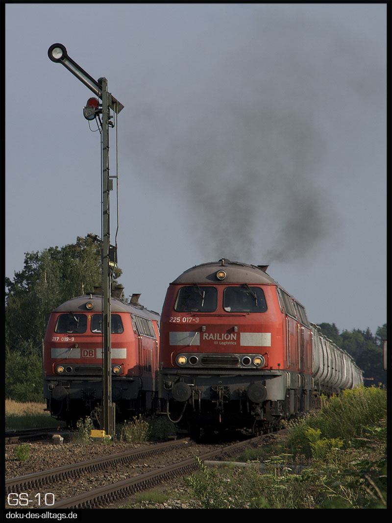 | 4. + 5.) Idealerweise zieht 225 017 ein Stück vor und 217 019 fällt ein Stück zurück, so daß sie den anderen Zug nicht verdeckt. | ||||||||||||||