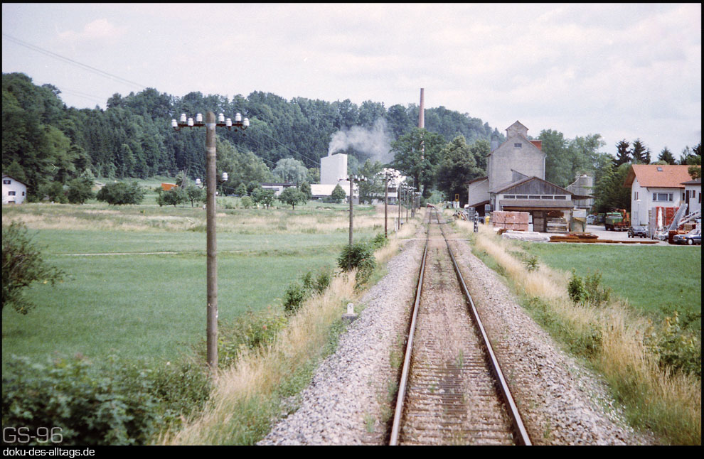 | 1.) Drei Kilometer südlich von Garching wird der Haltepunkt Wiesmühl (Alz) erreicht, nicht zu verwechseln mit Wiesmühl (b. Tittmoning), das an der Strecke Garching Freilassing liegt, 16 Kilometer Luftlinie südöstlich.