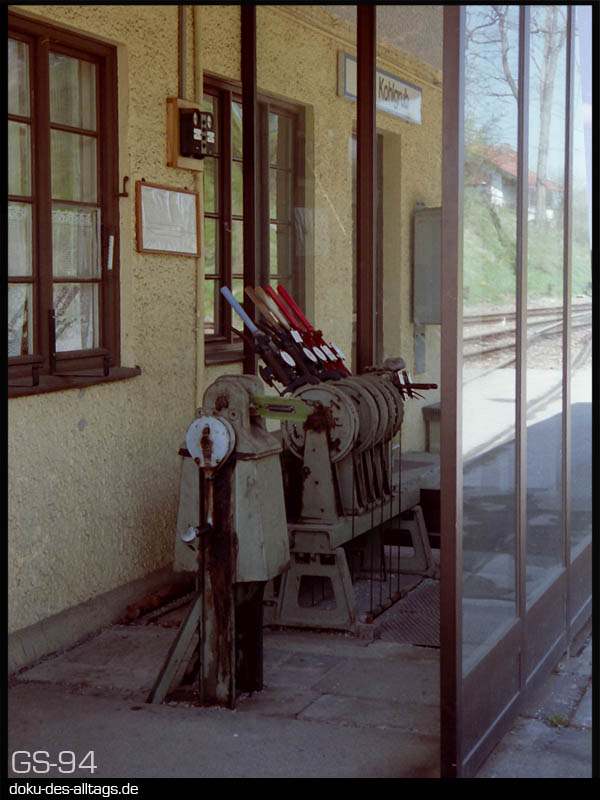 Der zweite Hebel von links ist für die Weiche zum Ladegleis, die sich rechts in der Scheibe spiegelt. Am Hebel ist über der runden Plakette mit der Weichennummer (4) ein zusätzliches eckiges Schild angebracht mit folgender Beschriftung: "zuerst einschalten". Das heißt nichts weiter, als die Oberleitung über dem Ladegleis erstmal unter Strom zu setzen. Bei Nichtbenutzung war diese abgeschaltet. Die beiden Einfahrtweichen haben die Nummern (1) und (5). Die beiden roten Hebel sind für die Einfahrtsignale. Ganz rechts von der Hebelbank sind die zwei Fahrstraßenhebel. Die Schrankenkurbel ist für den Bahnübergang an der Ausfahrt Richtung Oberammergau. |
