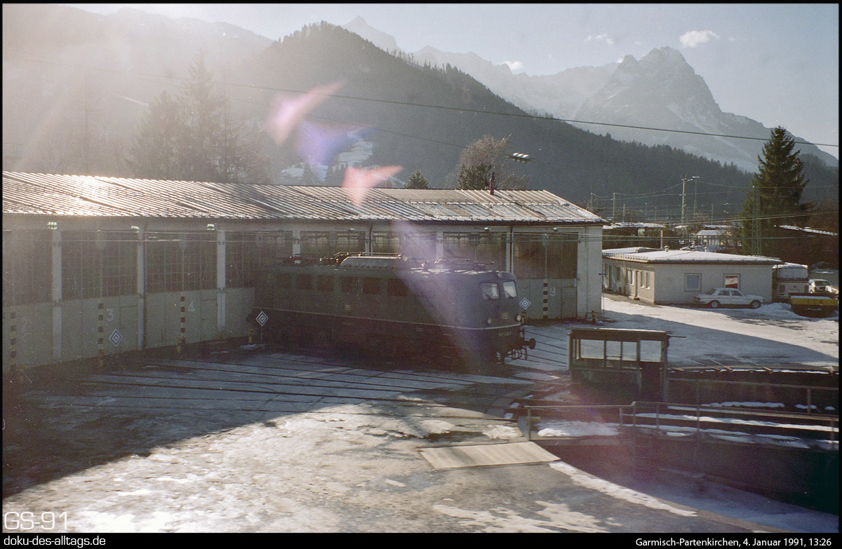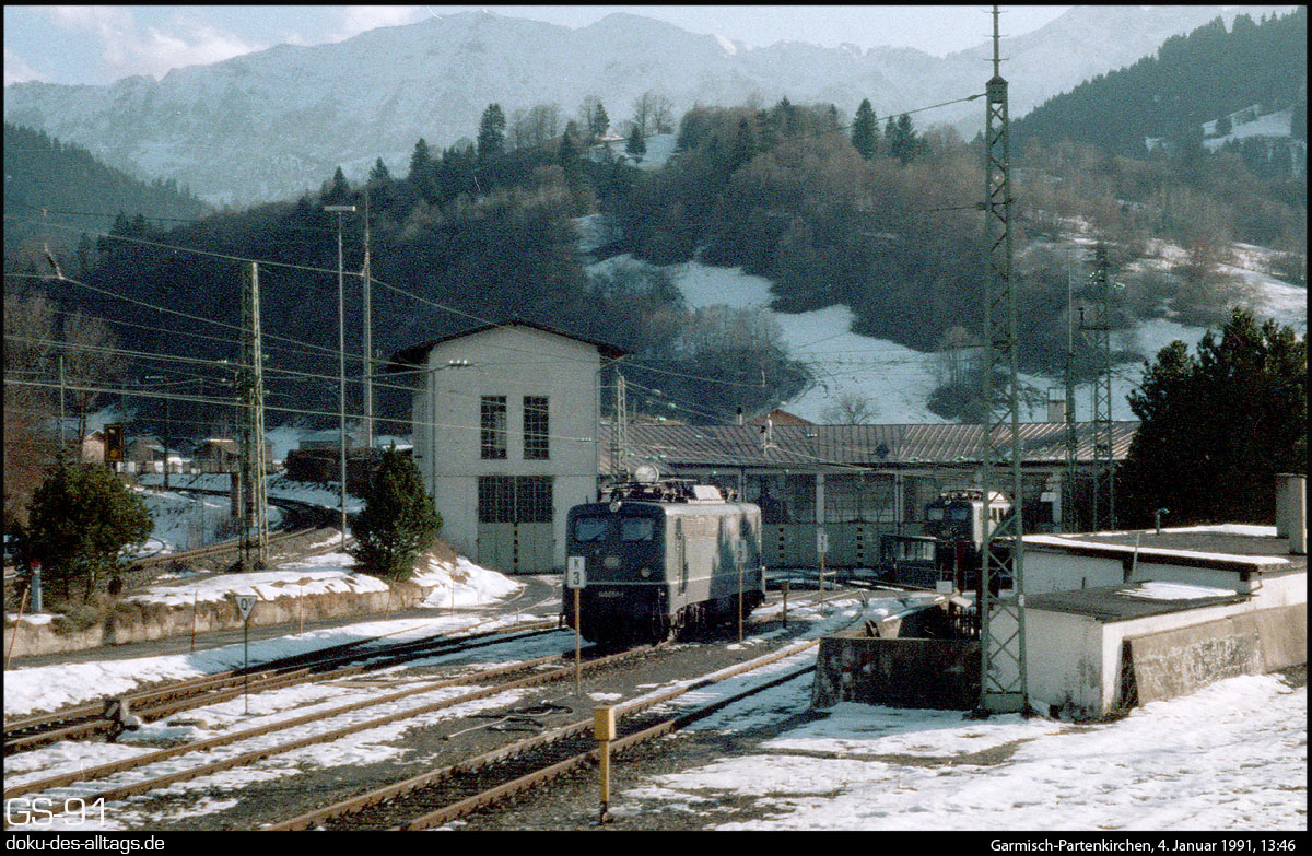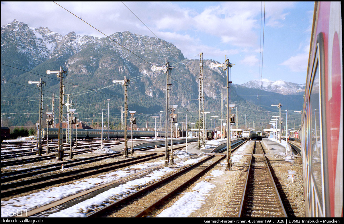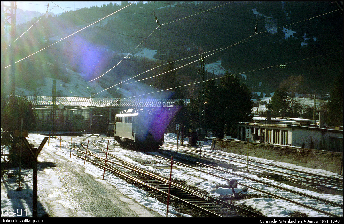 | 1.) Ausfahrt aus Garmisch am 4. Januar 1991 mit dem E 3685 München Garmisch. Noch immer ist in Garmisch eine 323 des Bw München 1 stationiert zum Verschieben der Reisezugwagen. | ||||||||||