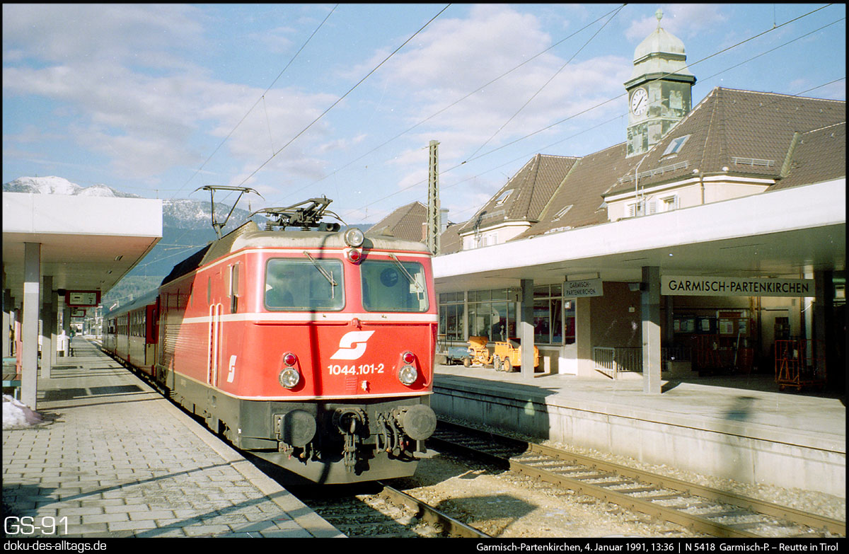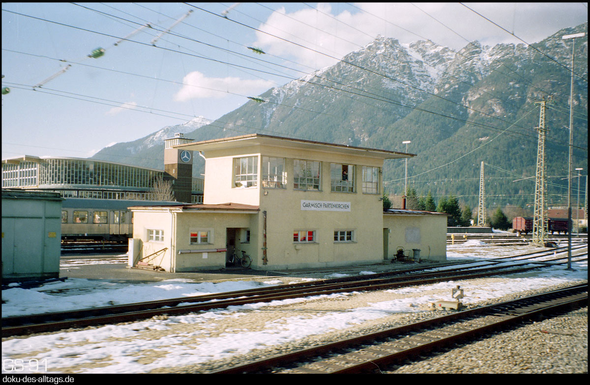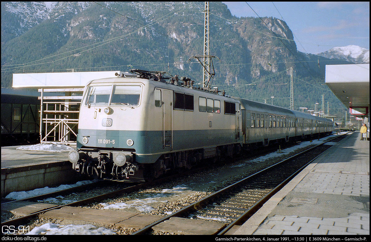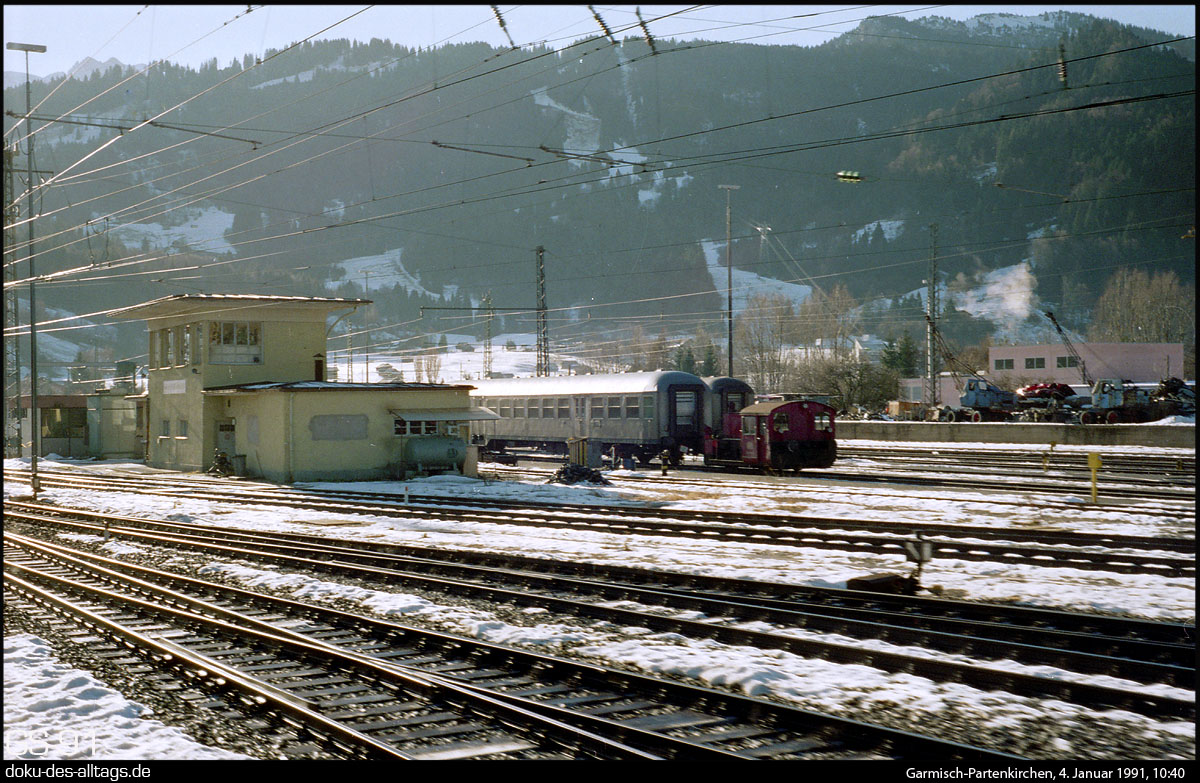 | 1.) Ausfahrt aus Garmisch am 4. Januar 1991 mit dem E 3685 München Garmisch. Noch immer ist in Garmisch eine 323 des Bw München 1 stationiert zum Verschieben der Reisezugwagen. | ||||||||||