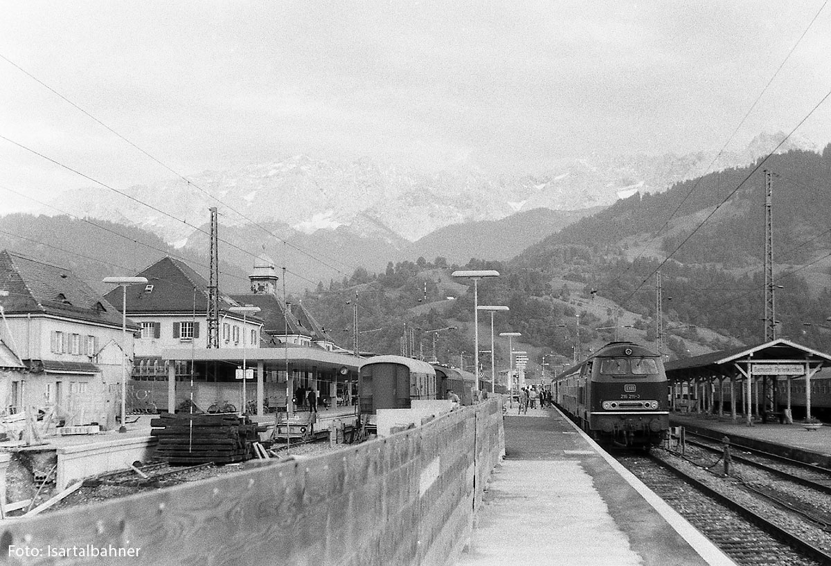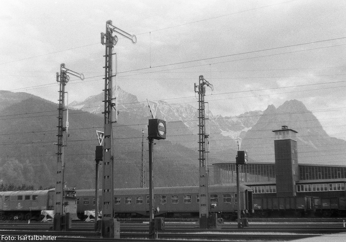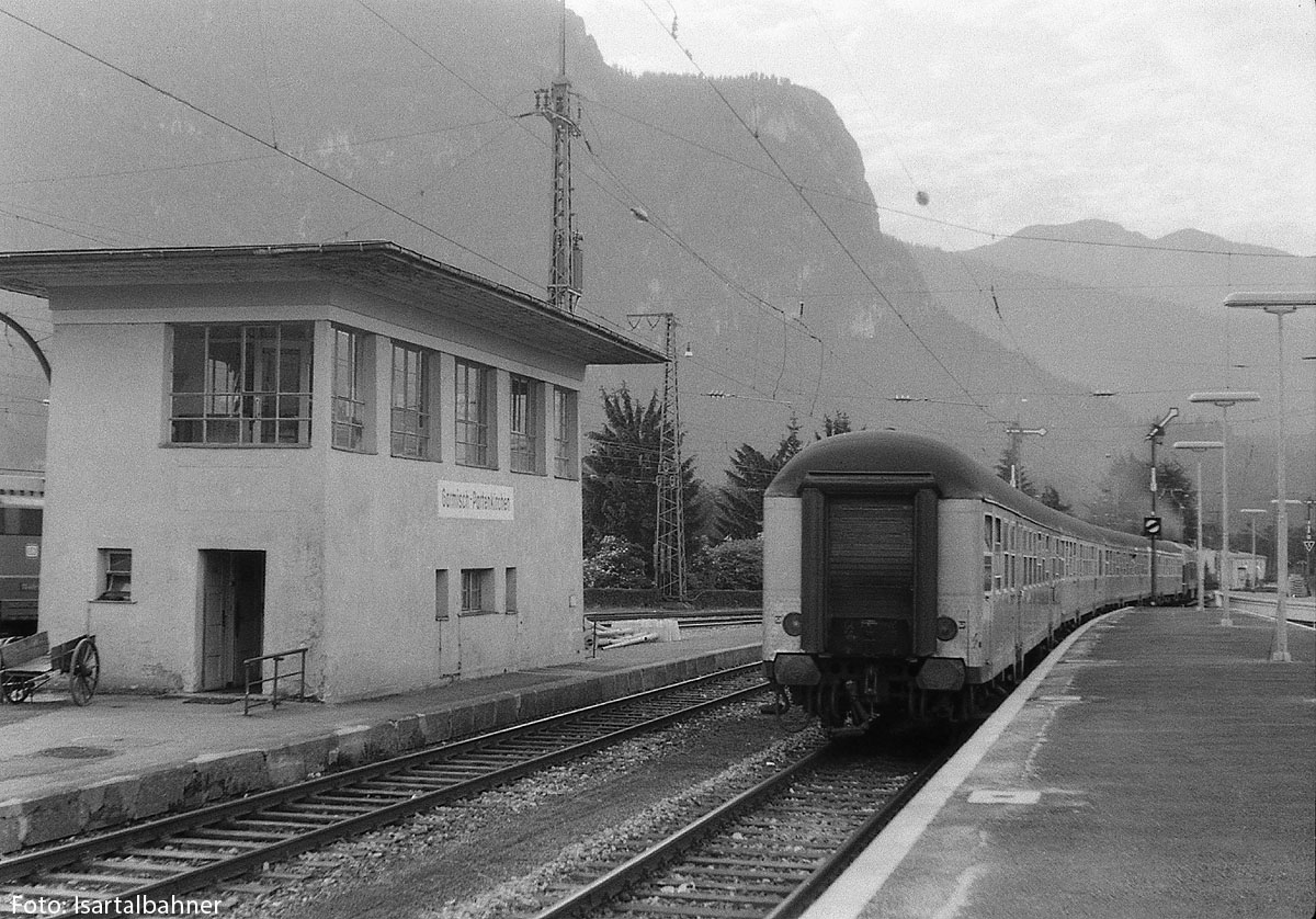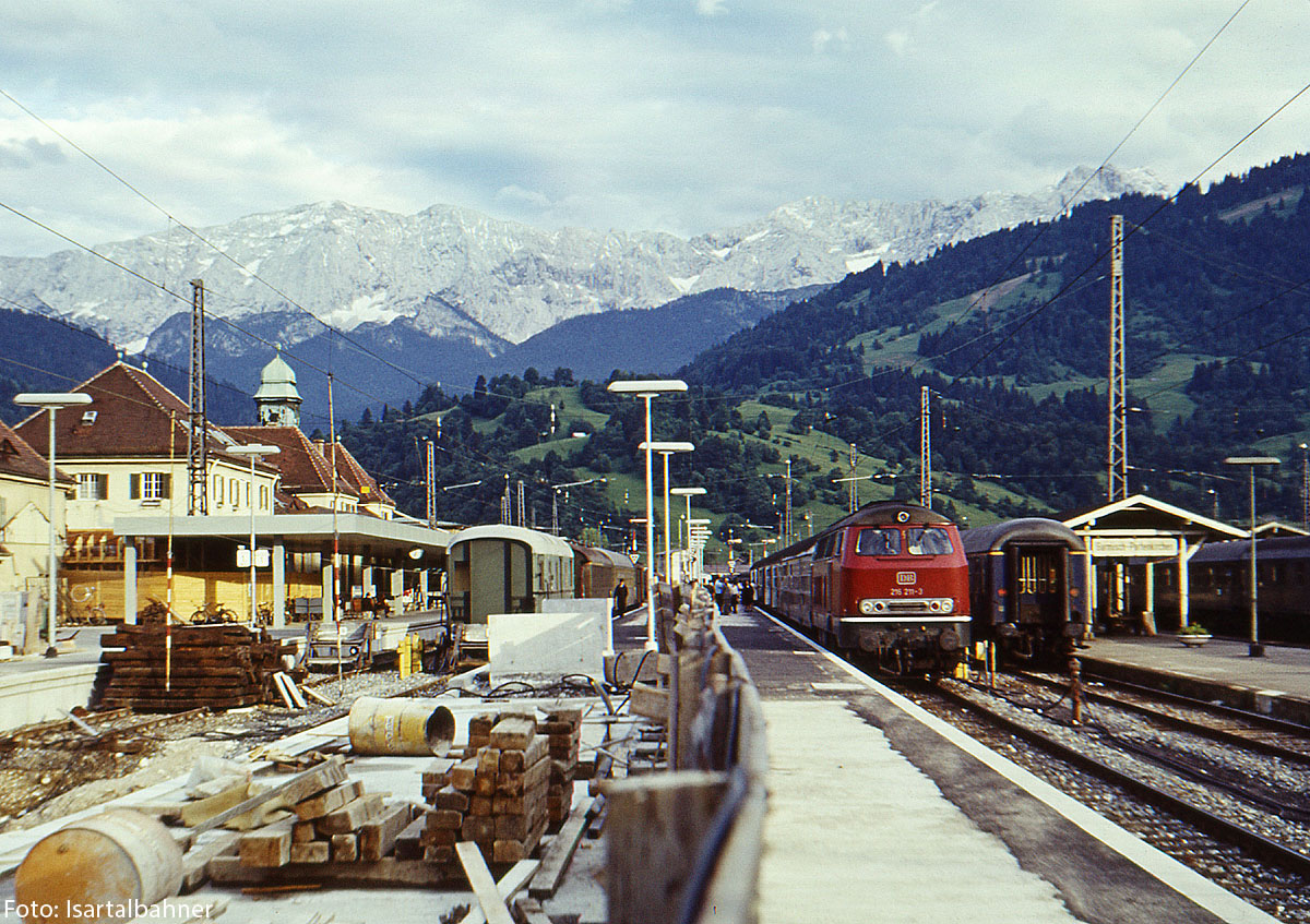 | Elektrisches und ein bisschen Diesel in Garmisch,20.6.1971 Nach einem Kurzbesuch in Oberammergau und sehr ausgiebigem Mittagessen, das sich gut in den Nachmittag hineinzog, ging´s nach Garmisch. Zu der Zeit waren die Bahnsteigumbauten in vollem Gange, wenigstens gelang es, noch ein Stück „Altbestand“ optisch sicherzustellen, dem später ein Bild gewidmet ist. (Text und Bilder: Paul Müller) |