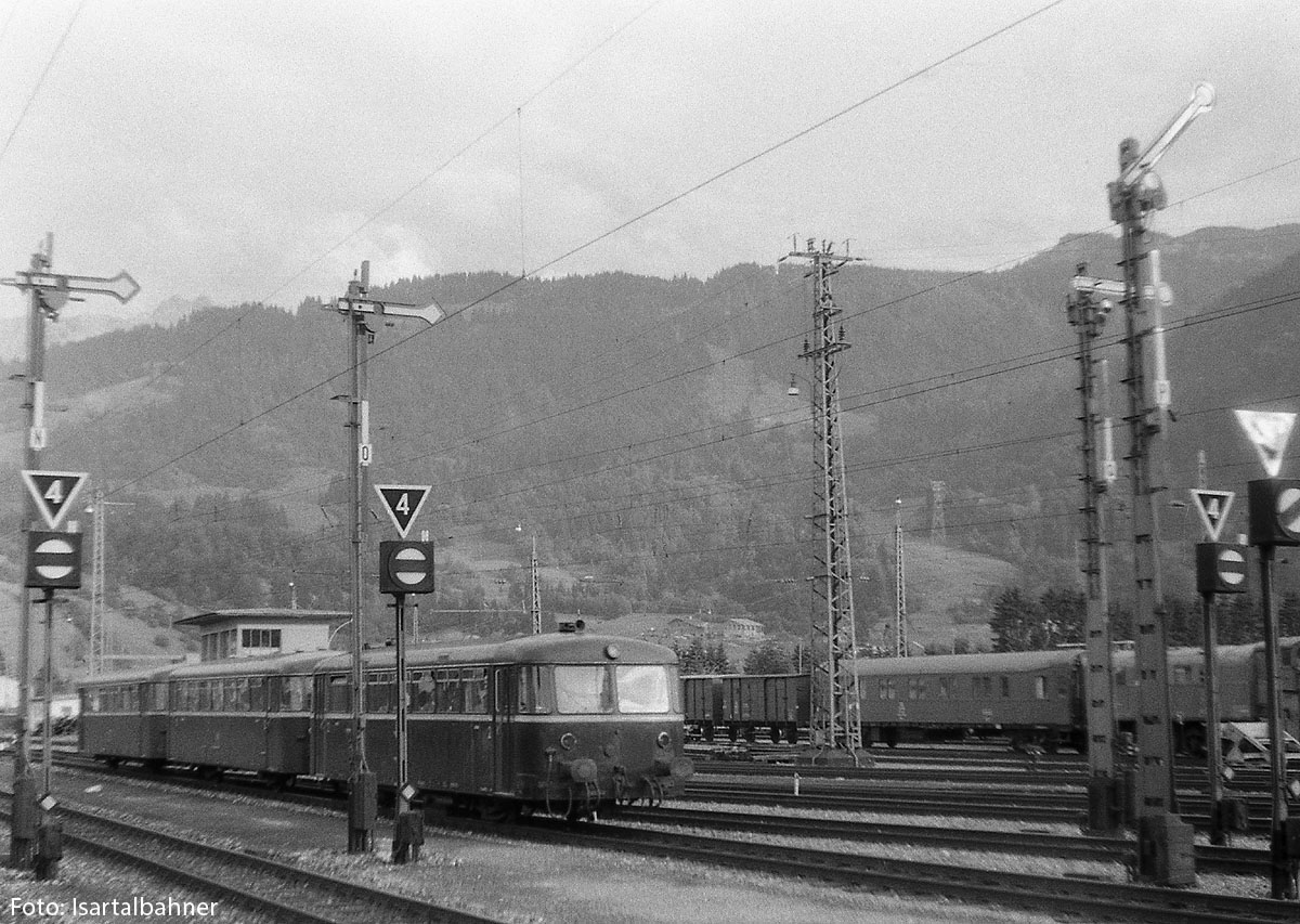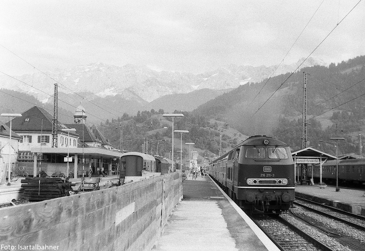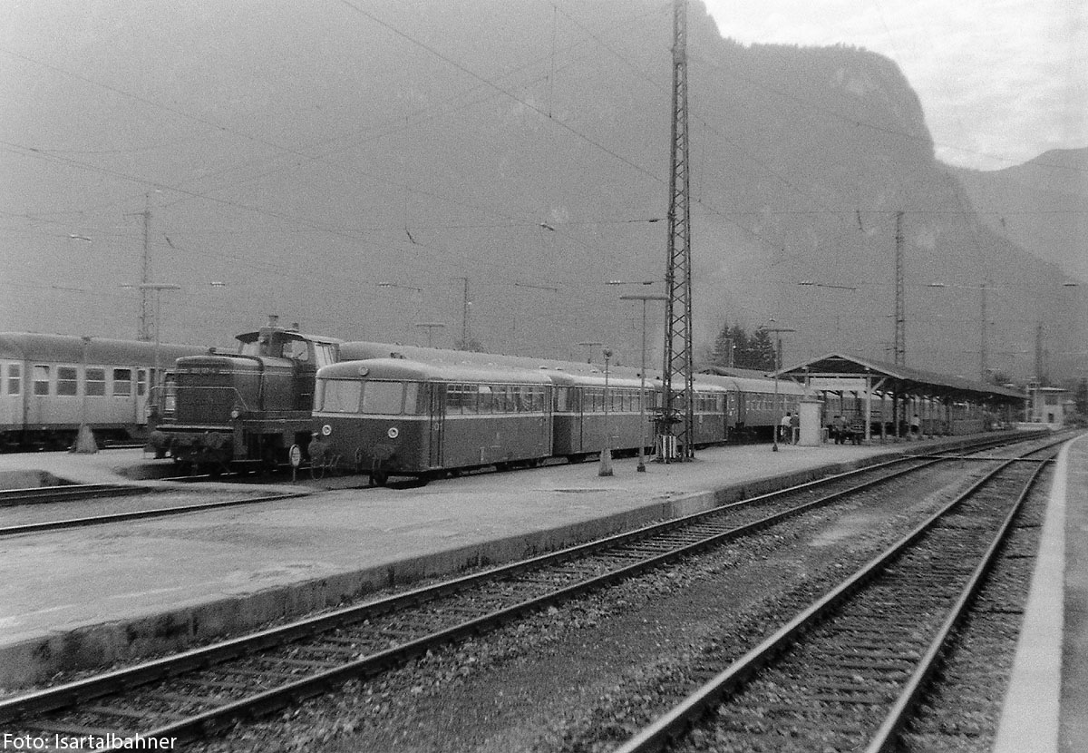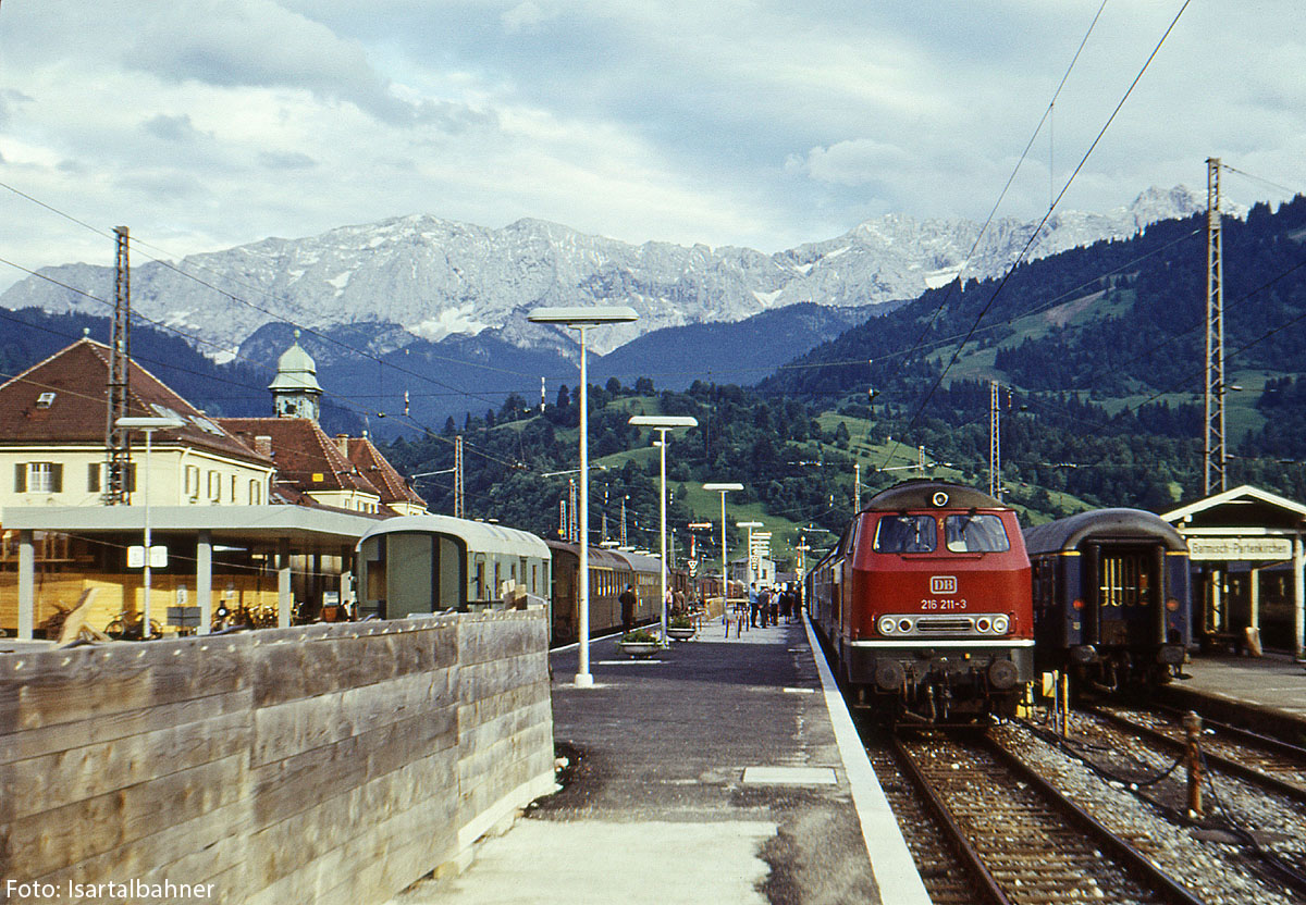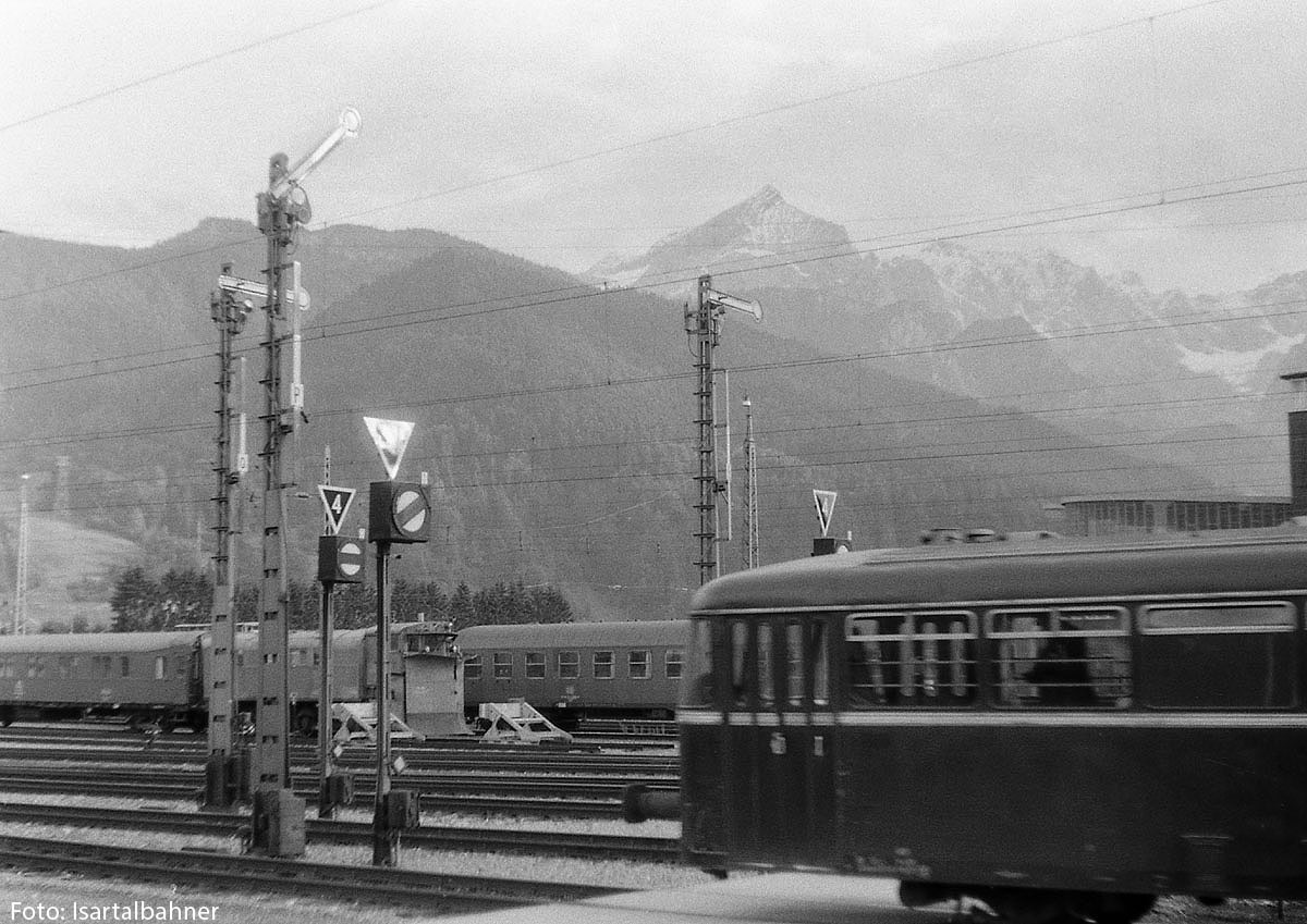 | Elektrisches und ein bisschen Diesel in Garmisch,20.6.1971 Nach einem Kurzbesuch in Oberammergau und sehr ausgiebigem Mittagessen, das sich gut in den Nachmittag hineinzog, ging´s nach Garmisch. Zu der Zeit waren die Bahnsteigumbauten in vollem Gange, wenigstens gelang es, noch ein Stück „Altbestand“ optisch sicherzustellen, dem später ein Bild gewidmet ist. (Text und Bilder: Paul Müller) |