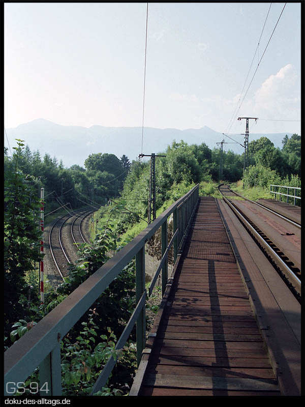 | 4.) Blick über die Überführung über die Hauptstrecke, die hier zweigleisig einen Bogen macht und in die Murnauer Rampenstrecke bis Hechendorf übergeht. | |||||