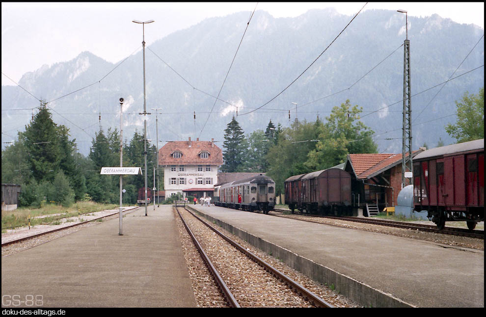 | 1.) Der Endbahnhof Oberammergau zum bevorstehenden Herbst 1988. Eine üblicher 2-Wagen-Wendezug füllt sich langsam mit Reisenden. Güterverkehr gabs auch noch 1988 und angesichts dreier auf dem Ladegleis abgestellten G-Wagen gar nicht so wenig. Bis 1987 fuhr 2x wöchentlich eine Übergabe mit einer Augsburger 211, nach 1987 mit 212. |