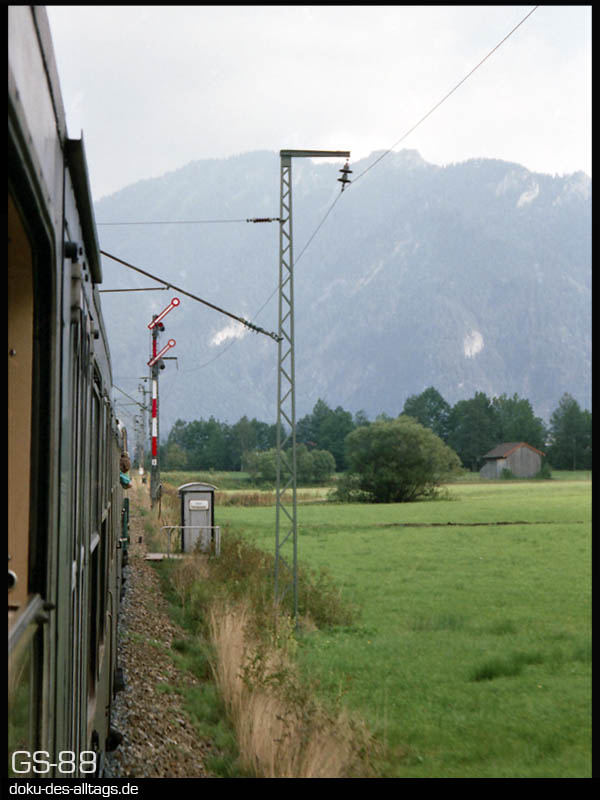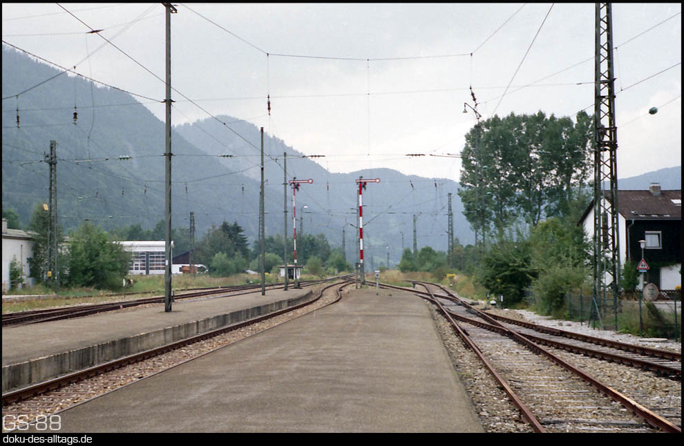 | 4.) Blick auf die Ausfahrt. In Hinblick auf Sonderzüge, die während der Passionsspiele Oberammergau anfuhren, aber auch Wintersportzüge, haben die Bahnsteige eine beachtliche Nutzlänge. 1988 wurden im Alltagsbetrieb noch zwei Bahnsteiggleise für Zugfahrten verwendet, wovon jedes noch sein eigenes Ausfahrtsignal hatte. Hinter dem linken Signal ist das Schlüsselstellwerk. Während der Rangierzeiten konnten dort mittels Rangierschlüssel die Weichenschlüssel freigeschlossen werden. Die Einfahrtsweiche 3 zu den beiden Hauptgleisen, deren Ausfahrtsignale, sowie das Einfahrtsignal wurden vom Fdl-Stellwerk (Bauart S&H) im Empfangsgebäude aus bedient.