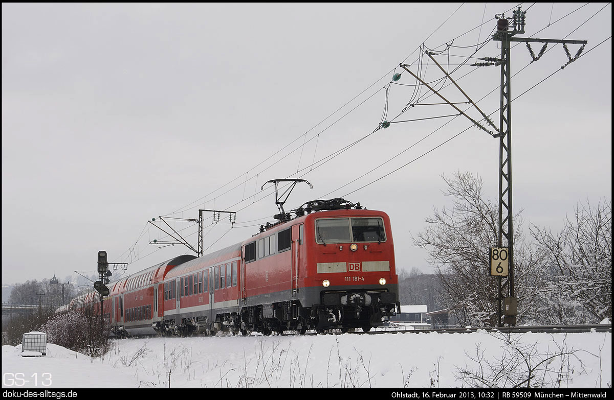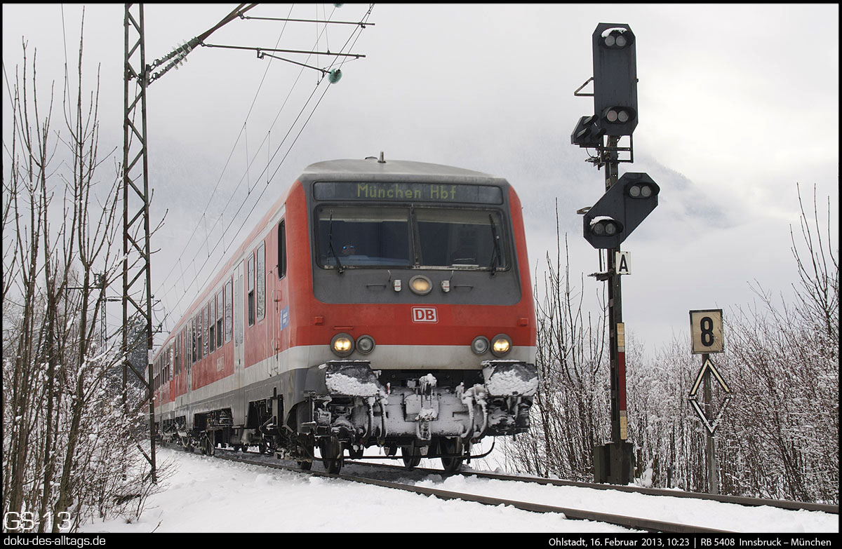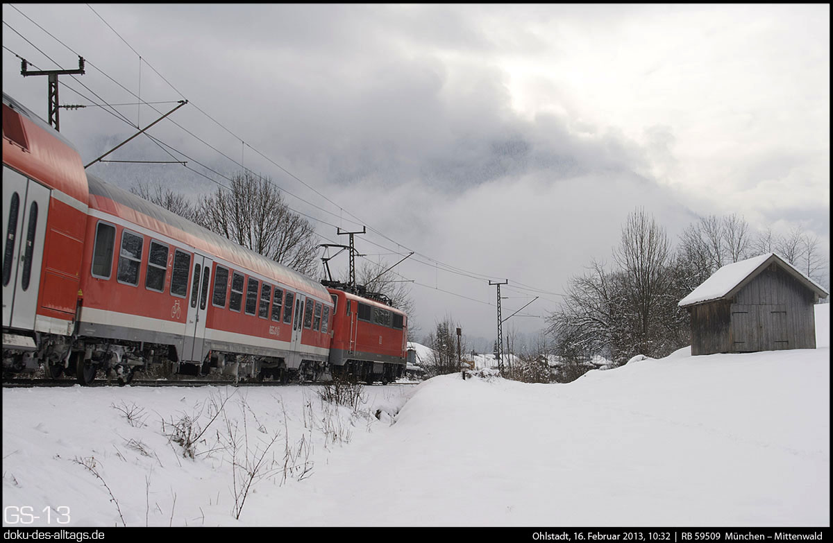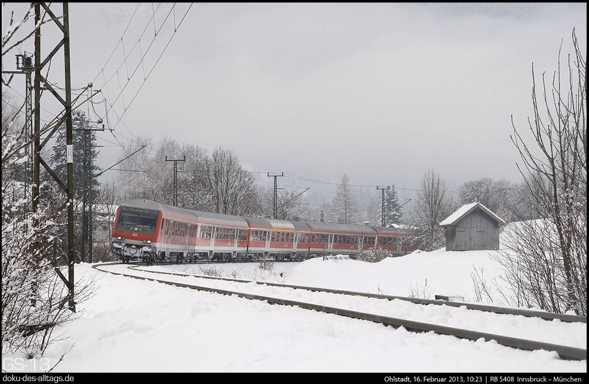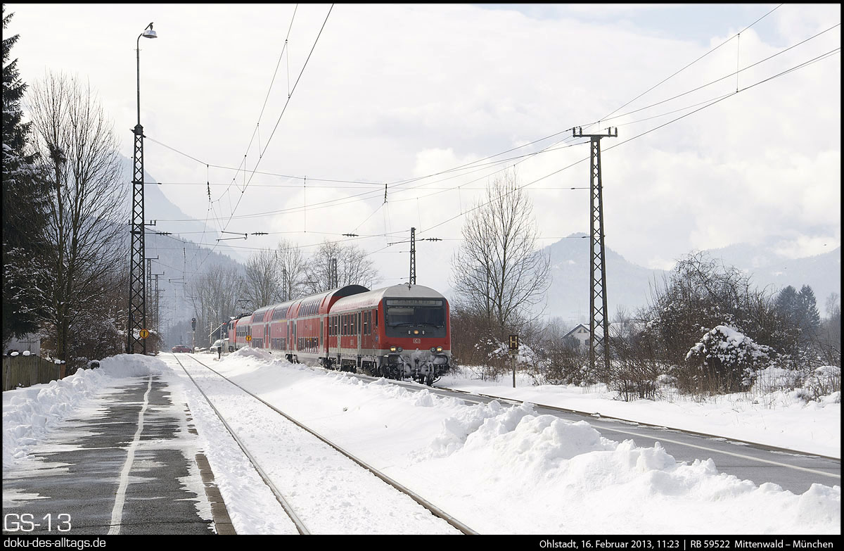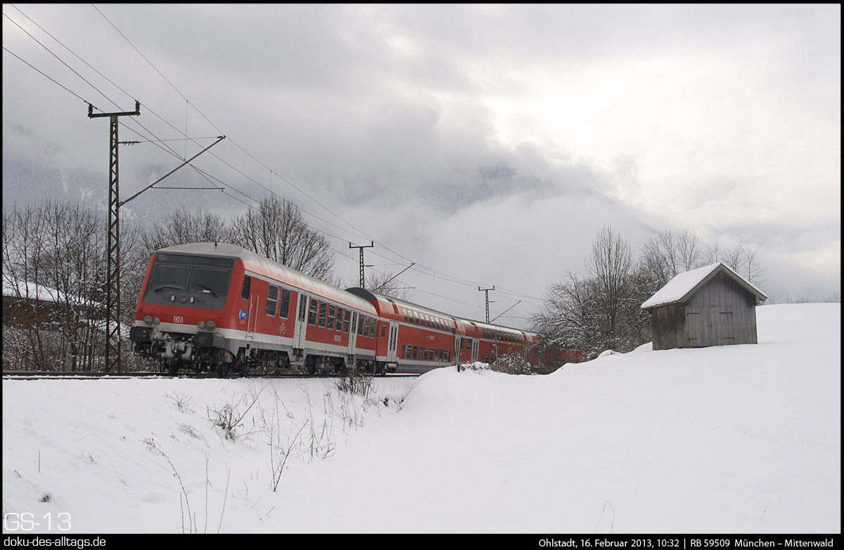 | 4.) In Murnau erfolgte die Kreuzung mit dem Gegenzug nach Mittenwald. Alle Züge mit Doppelstockwagen müssen in Mittenwald enden, das Lichtraumprofil im Karwendelbahn-Abschnitt bis Innsbruck lässt diese Wagen dort nicht zu. | |||||||