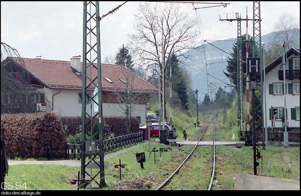 2. + 3.) Der weitere Streckenverlauf nach Oberammergau. Wie in Bad Kohlgrub gibt es auch hier einen mechanischen Bahnübergang. Im Hintergrund das Einfahrtsignal, das nach dem Rückbau des Bahnhofs als Deckungssignal für den Bahnübergang fungierte. Bahnsteigseitig wurde der Abfahrtsbefehl ja durch den Fahrdienstleiter erteilt, so daß hier eine beleuchtete H-Tafel genügt. | |||||