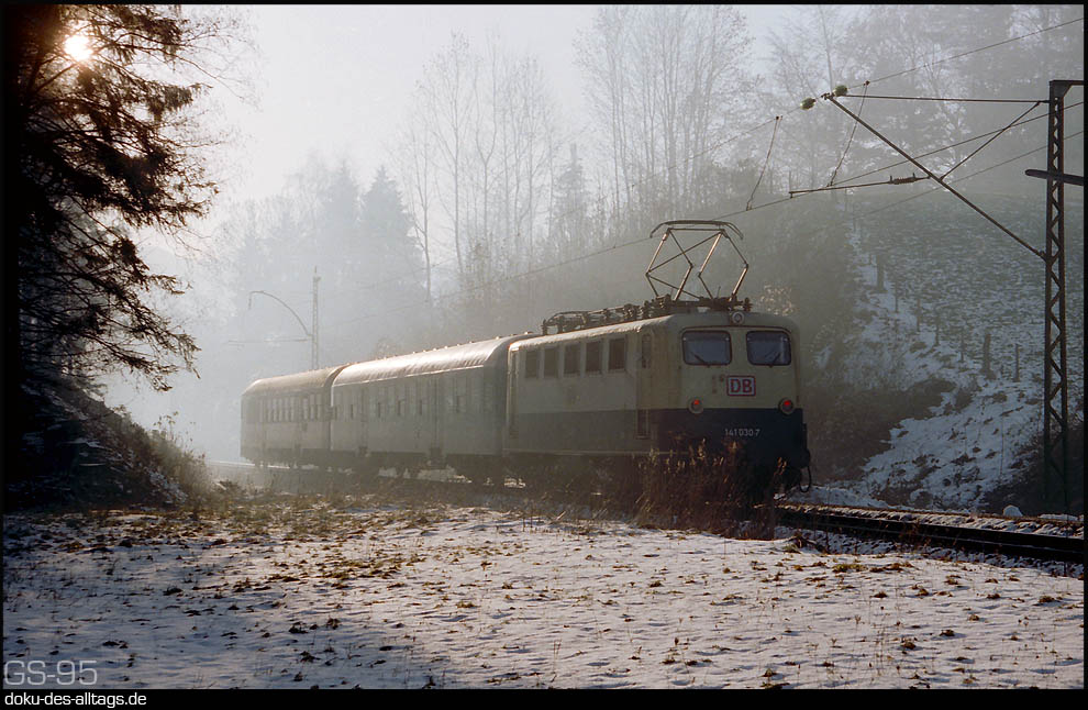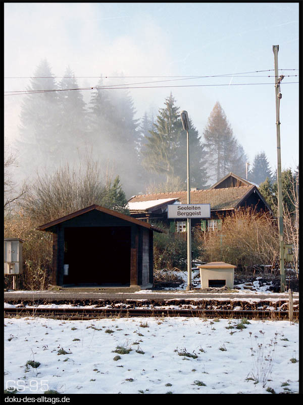 | An den Alpenrändern kann der Herbst auch schnell mal in den Winter überwechseln. In den Nachmittagsstunden wachsen auch schon die ohnehin um diese Jahreszeit großen Schattenbereiche und dort wo noch die Sonne hinscheint, ist der aufkommende Nebel in ein unwirkliches Licht getaucht. So auch an diesem Spätoktobertag 1995, an dem der Hp. Seeleiten-Berggeist an der Strecke Murnau - Oberammergau seinem Namen alle Ehre macht und sich in den Wäldern sicherlich allerlei Gelichter der Berge umhertreibt ;-) |