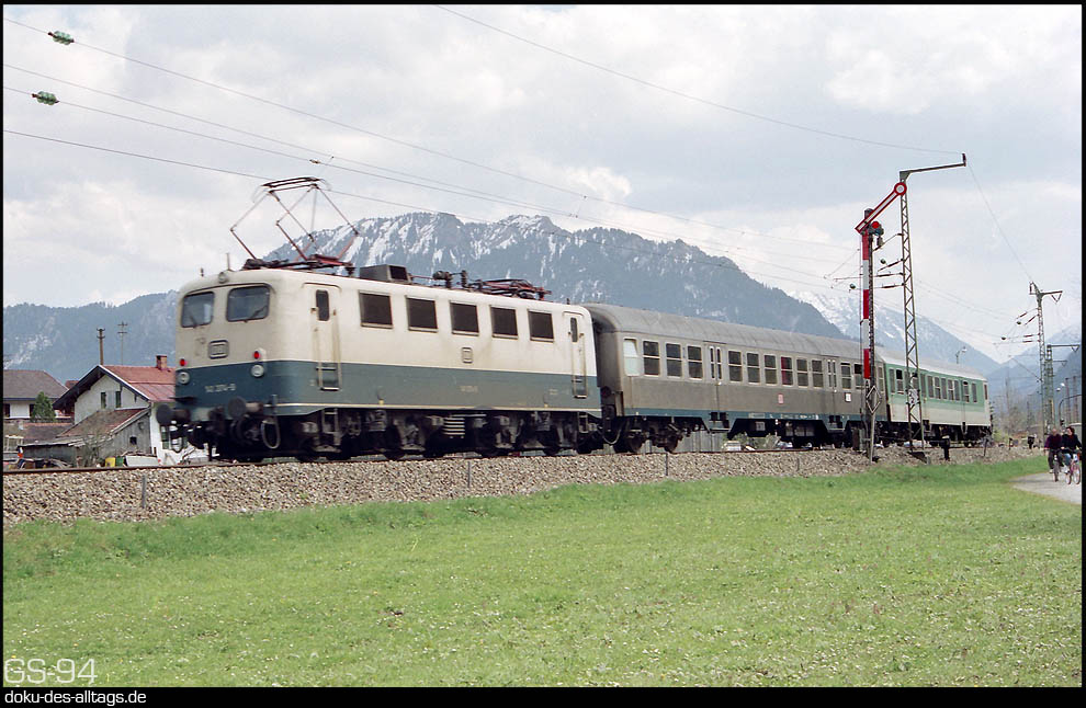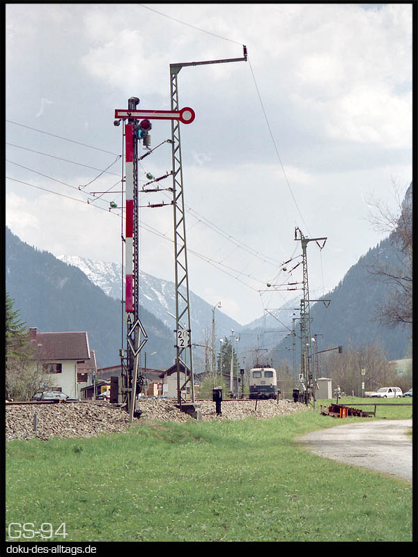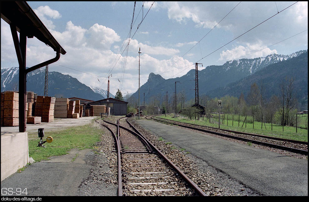 | 1.) Unterammergau besitzt 1994 nur noch ein durchgehendes Streckengleis. Das Gleis 1 dient noch als Anschluß an ein Sägewerk und endet in Richtung Oberammergau stumpf. Das ehemalige Gleis 3 ist längst nicht mehr vorhanden. Das EG ist noch besetzt, im Gebäudeteil unter der Uhr befindet sich das Fdl-Stellwerk. | ||||