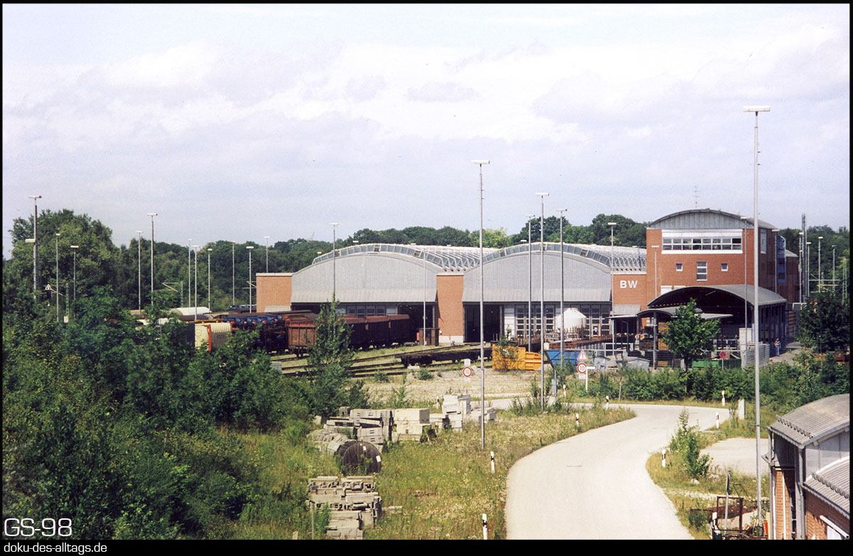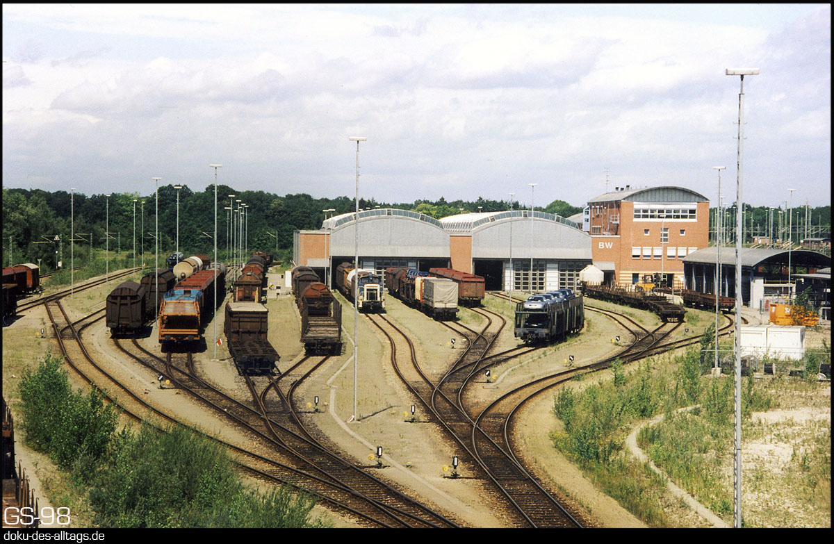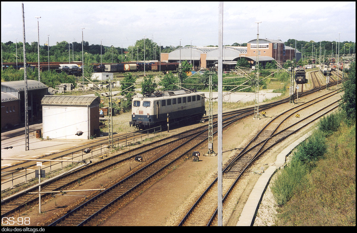 | 2.) Nicht weit entfernt steht 150 109 auf Gleis 271 im Bereich der Tfz-Abstellgruppe. Die Lok wurde am 30.4.1965 beim Bw Hagen-Eckesey in Dienst gestellt und zog seither schwere Güterzüge quer über das Netz der DB. Erst 2001 wurde sie zum ersten und letzten Mal umbeimatet: nach Kornwestheim, wo sie 2002 ausgemustert wurde. Im gleichen Jahr wurde sie in Opladen zerlegt. Im Hintergrund die große Halle der Güterwagenausbesserung. |