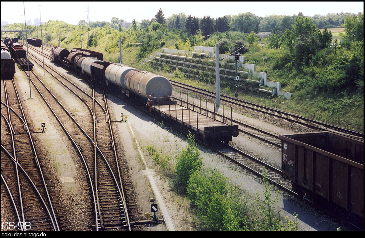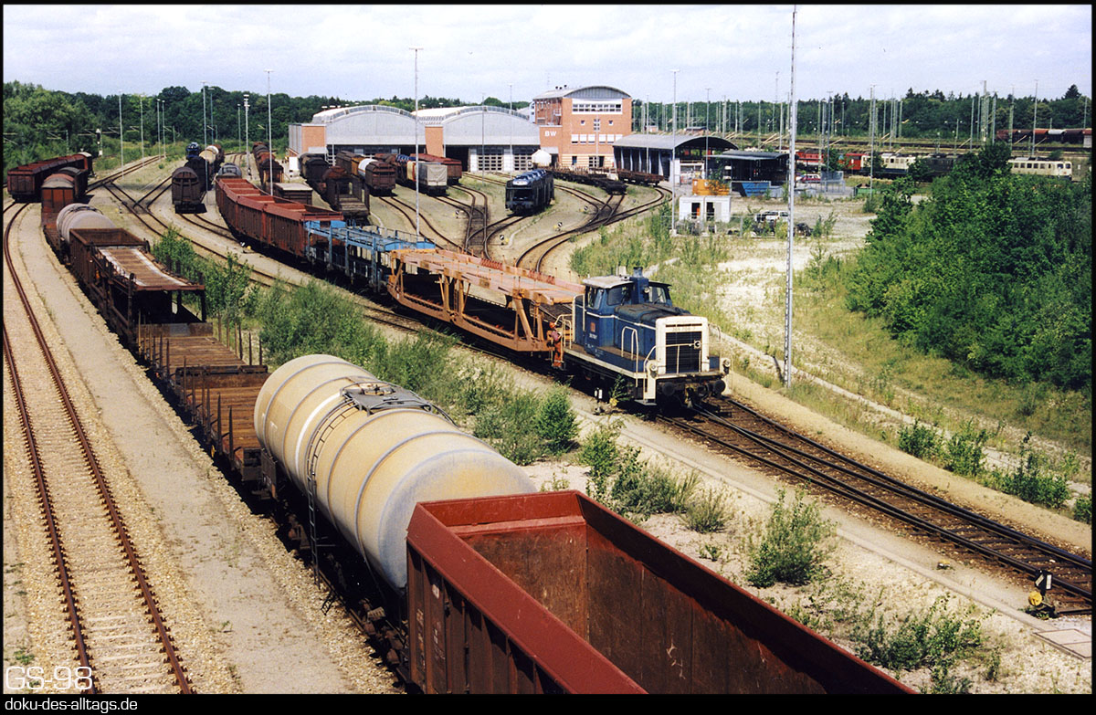 | 4.) 365 708 (ex V60 708; ex 261/361 708) ist dort mit dem Verschub von Güterwagen beschäftigt. Im Gegensatz zu der auf dem nächsten Bild zu sehenden 364 876 ist sie heute (2016) noch als modernsierte 363 708 im Einsatz. Die Lok wurde am 17.3.1960 in Dienst gestellt und war bis 1979 in Hamburg-Harburg beheimatet. Anschließend bis 1989 in Lübeck. Von da an war sie immer für einige Jahre abwechselnd in München und in Ingolstadt stationiert. Seit 1.7.2014 wieder in Ingolstadt.