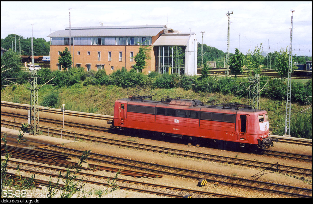 | 1.) 151 002-3 vor dem Verwaltungsgebäude auf einem der Zufahrtsgleise zum Bw. 151 002 wurde als Zweite ihrer Baureihe am 18. April 1973 in Dienst gestellt, etwa zwei Monate nach der 151 001. Die 170 Maschinen waren als Nachfolgereihe der Baureihe 150 gedacht. Obwohl sie um einiges mehr Leistung hatte und mit einer V/max von 120 km/h deutlich schneller ist als die 100 km/h schnelle 150 existierten die beiden Baureihen noch 30 Jahre einträchtig nebeneinander, bis die letzten 150er im Jahre 2003 ausgemustert wurden.