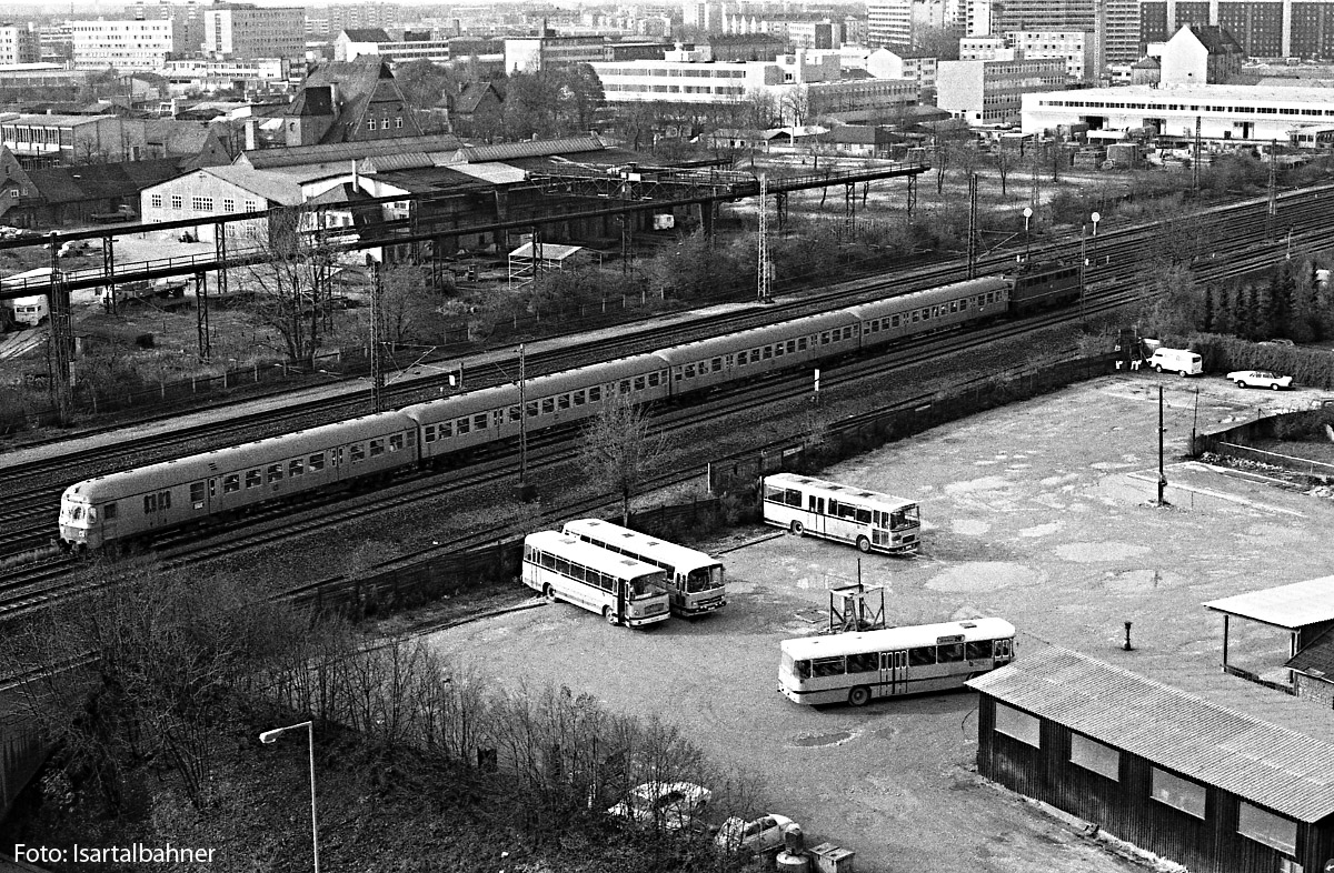 14.) Am 15.9.1977 stand Claus-Jürgen Schulze auf dem Dach des Flamuco-Gebäudes und fotografierte den E 3536 aus Bayrischzell, bespannt mit 218 344. Dahinter das leergeräumte Beutler-Gelände, links davon das Gleis rauf zur Ganghoferstraße und rein ins Messegelände.