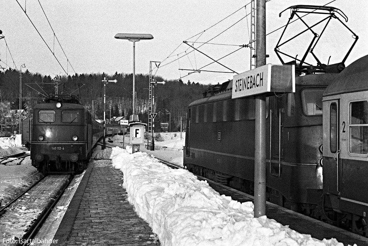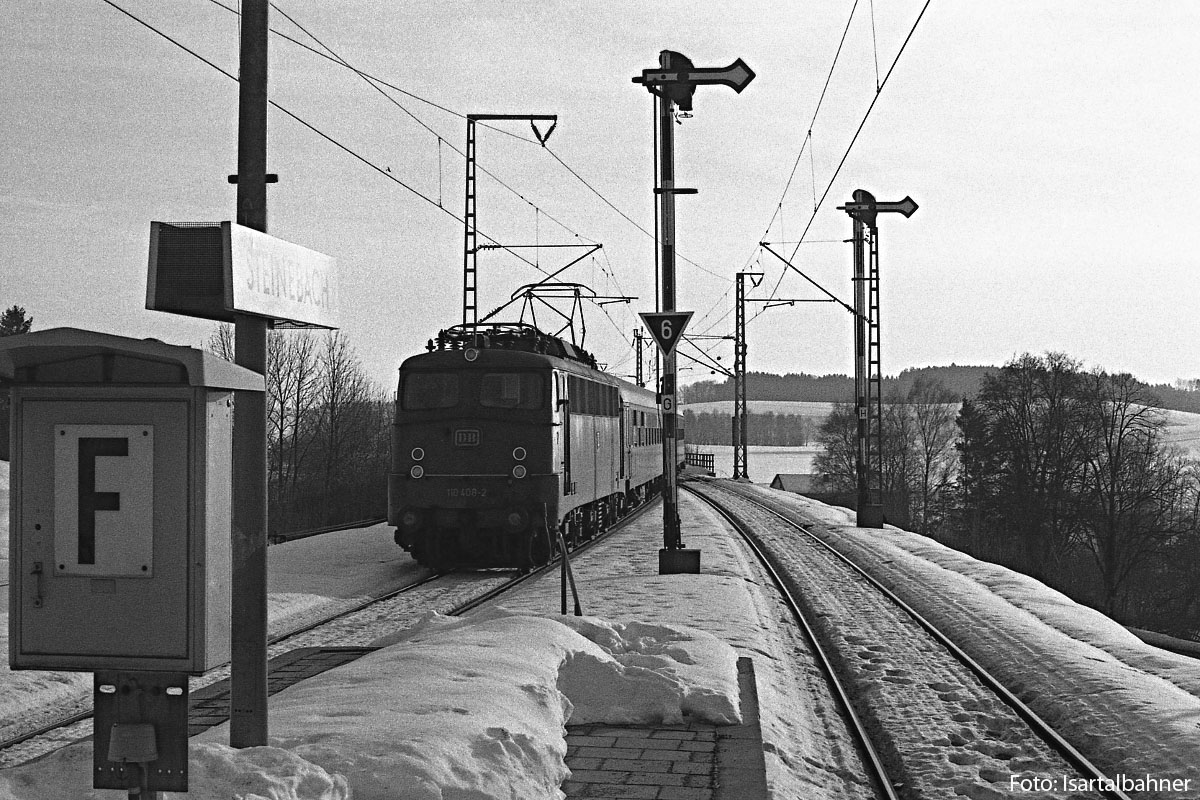 | 1.) Bahnhof Steinebach mit "Fernverkehr" (Erläuterung siehe hier). 110 408 fährt am 23.2.1978, von Herrsching kommend, in den noch mit bayerischen Formsignalen (in Reichsbahnausführung, keine durchbrochenen Flügel) bestückten Bahnhof Steinebach ein. | ||||||||