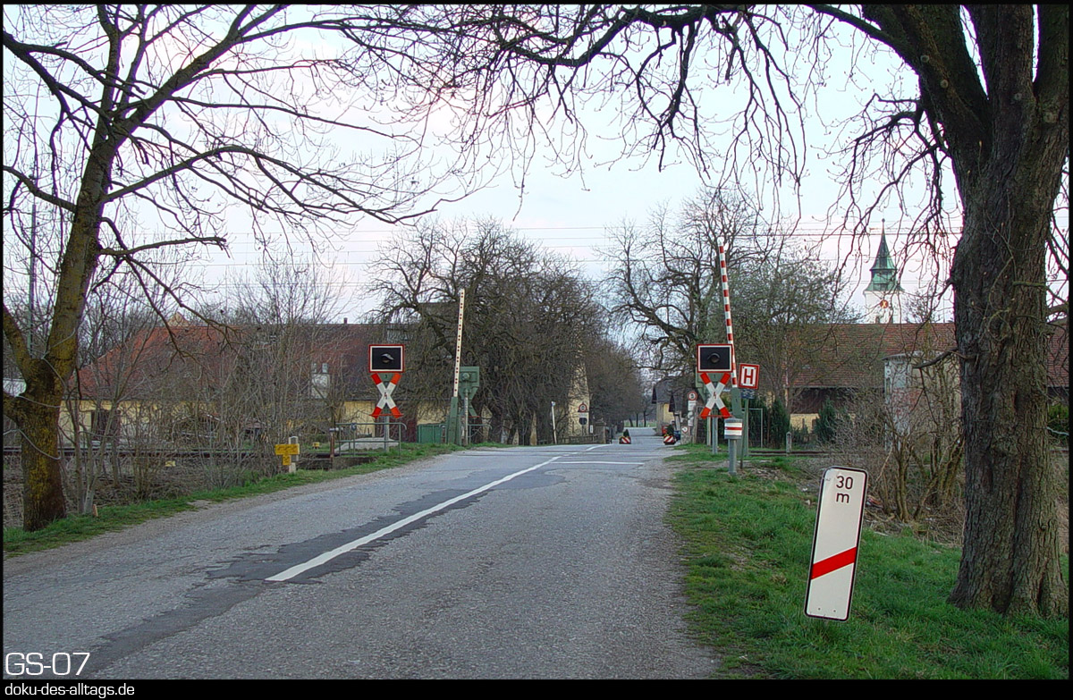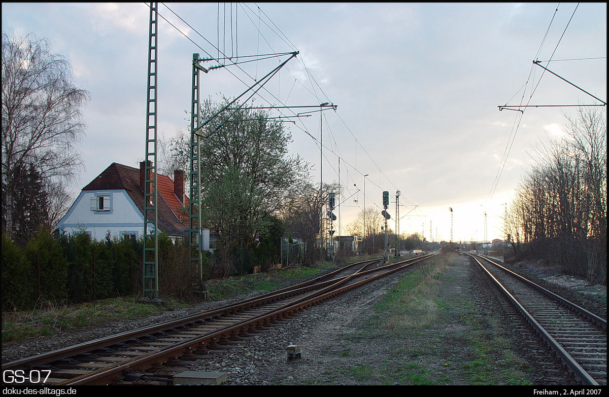 | 2.) Der ursprüngliche Bahnhof Freiham (km 5,1), vom Bahnübergang aus gesehen. Er wurde 1903 zusammen mit der Strecke in Betrieb genommen. Mit der Aufnahme des S-Bahnbetriebs 1972 wurde er noch Bestandteil des S-Bahnnetzes und bekam einen Hochbahnsteig zwischen den Gleisen 2 und 3. Der Bahnhof erwies sich für die S-Bahn unrentabel und wurde 1975 für den Personenverkehr aufgegeben. Für den an der südwestlich abzweigenden Anschluss zum Tanklager Krailling hat die Betriebsstelle bis heute Bedeutung. Zwischen den beiden Signalen ist das Betriebsgebäude aus den 1970er Jahren zu sehen. | |||||||
