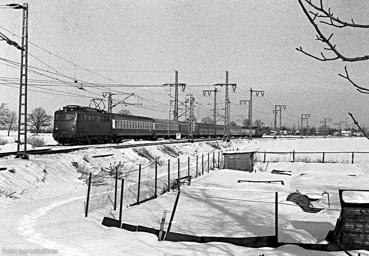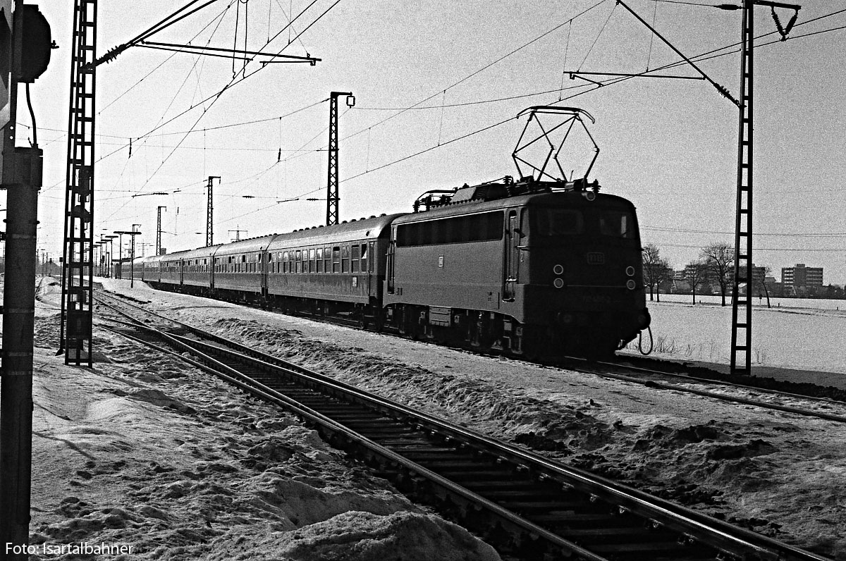 | 4.) Anfang 1978 herrschte ein strenger Winter. Wegen starken Schneefalls in den vorangegangenen Tagen und einem fast entgleisten 420 im Bahnhof Weßling, hatte sich Lokdezernat und OZL entschieden, in München endende D-Züge als Zwischenleistung als S-Bahnersatz auf die Herrschinger Strecke zu schicken. Am 23.02.1978 schien bereits wieder die Sonne und die Gleise waren wieder weitgehend frei. Hier 140 461 (Bw Mainz-Bischofsheim) und am anderen Ende 110 408 (Bw Hamburg-Eidelstedt) von München kommend bei der Einfahrt in Freiham.