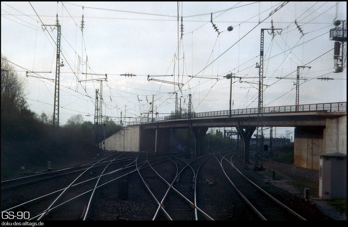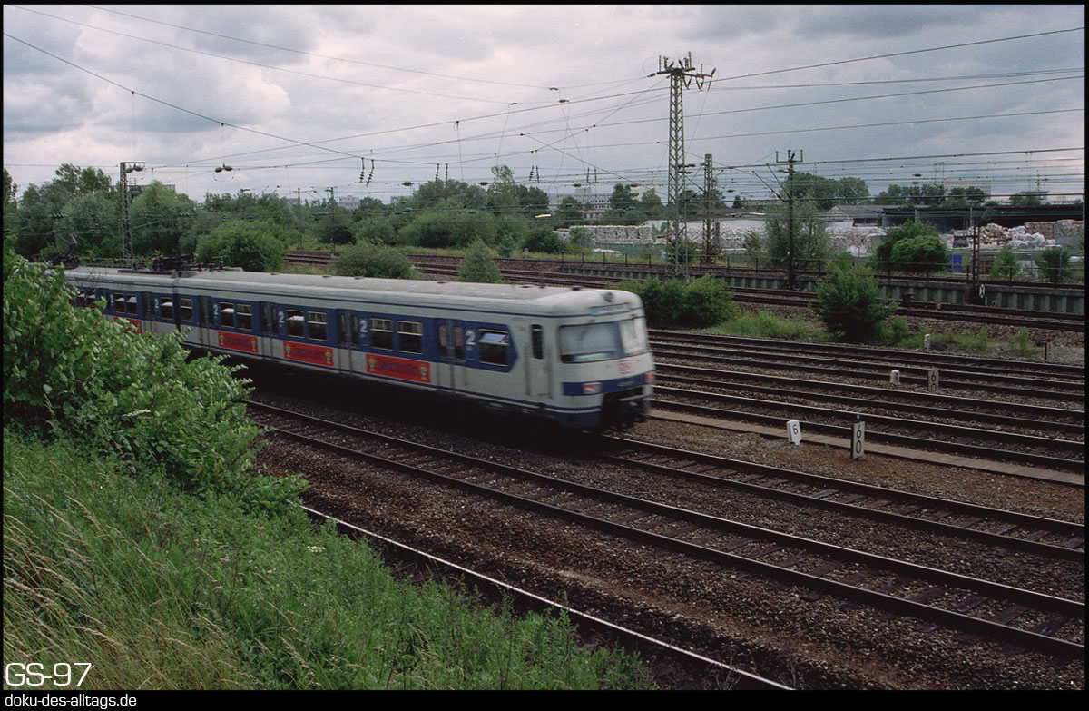 | 2.) Abzw. Neulustheim: km 6,0 im Sommer 1997: Hier hat sich seit der Zeit viel verändert. Im Zuge des ICE-Streckenausbaus nach Nürnberg wurde hier die Einfädelung in den verbliebenen Laimer Rbf mit einem Überwerfungsbauwerk neu gestaltet. Das Gütergleis aus Allach wird nun hier bereits über die Fern- und S-Bahngleise geführt, was zur Stillegung der auf den Bildern 1. - 4. zu sehenden Verbindung führte. Hier ist es noch zu sehen, das äußerste Gleis gegenüber des Fotostandortes, wo auch die S-Bahngleise der S 1 ansteigen und vor dem Abzweig "Kanal" über die 4 Fernbahngleise führen. Dabei überquert die eingleisige Güterstrecke die Abstellbahn, die beiden S-Bahngleise berühren diese Trasse nur kurz in einem Bogen. Das Bild entstand von oberhalb der Böschung der Abdrückgleise von Laim Rbf. Der 420 ist auf der S2 unterwegs. |