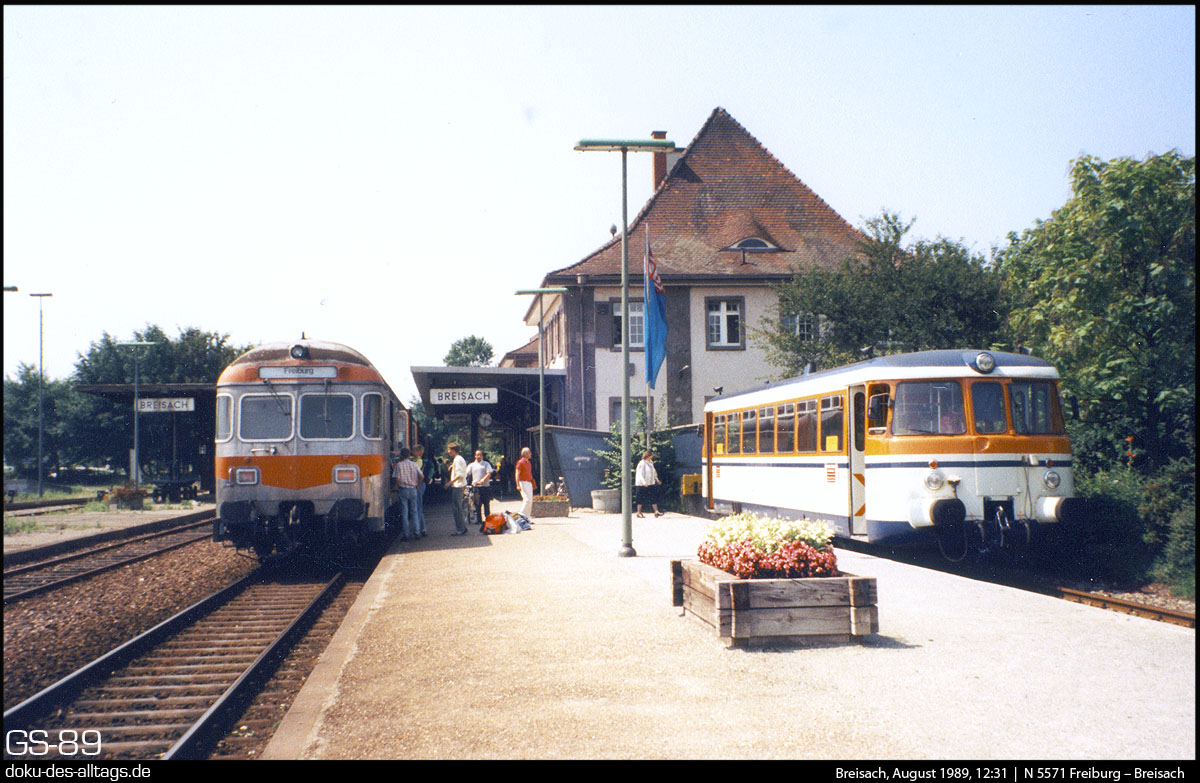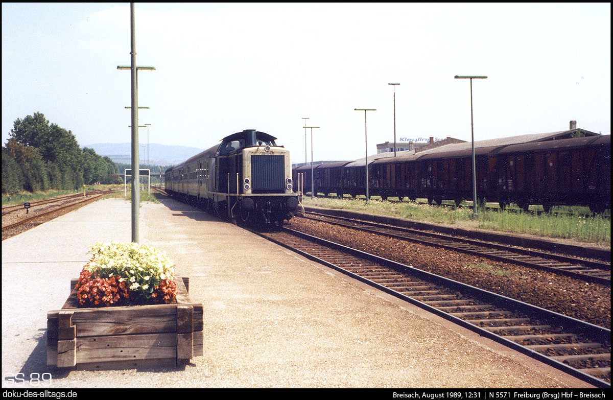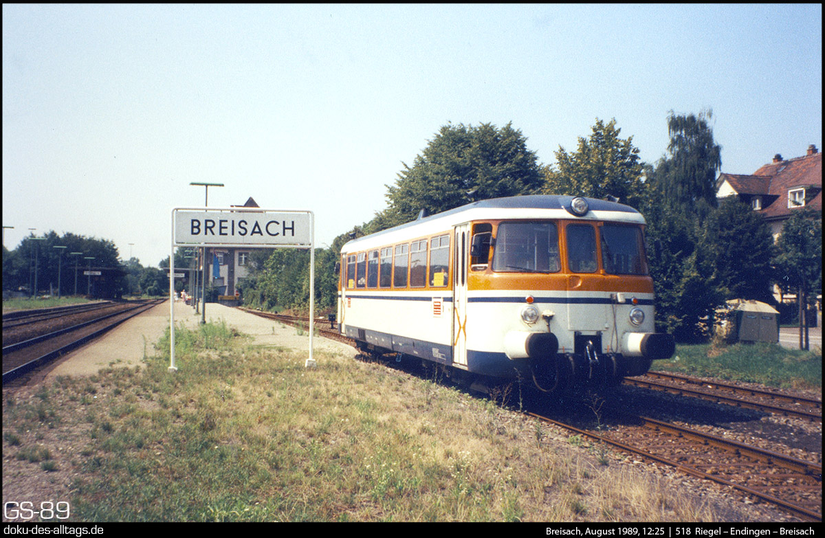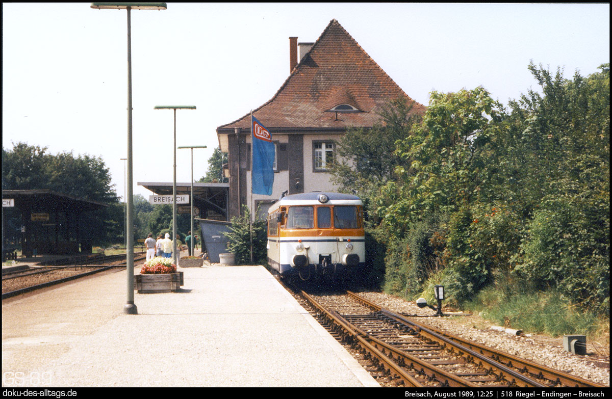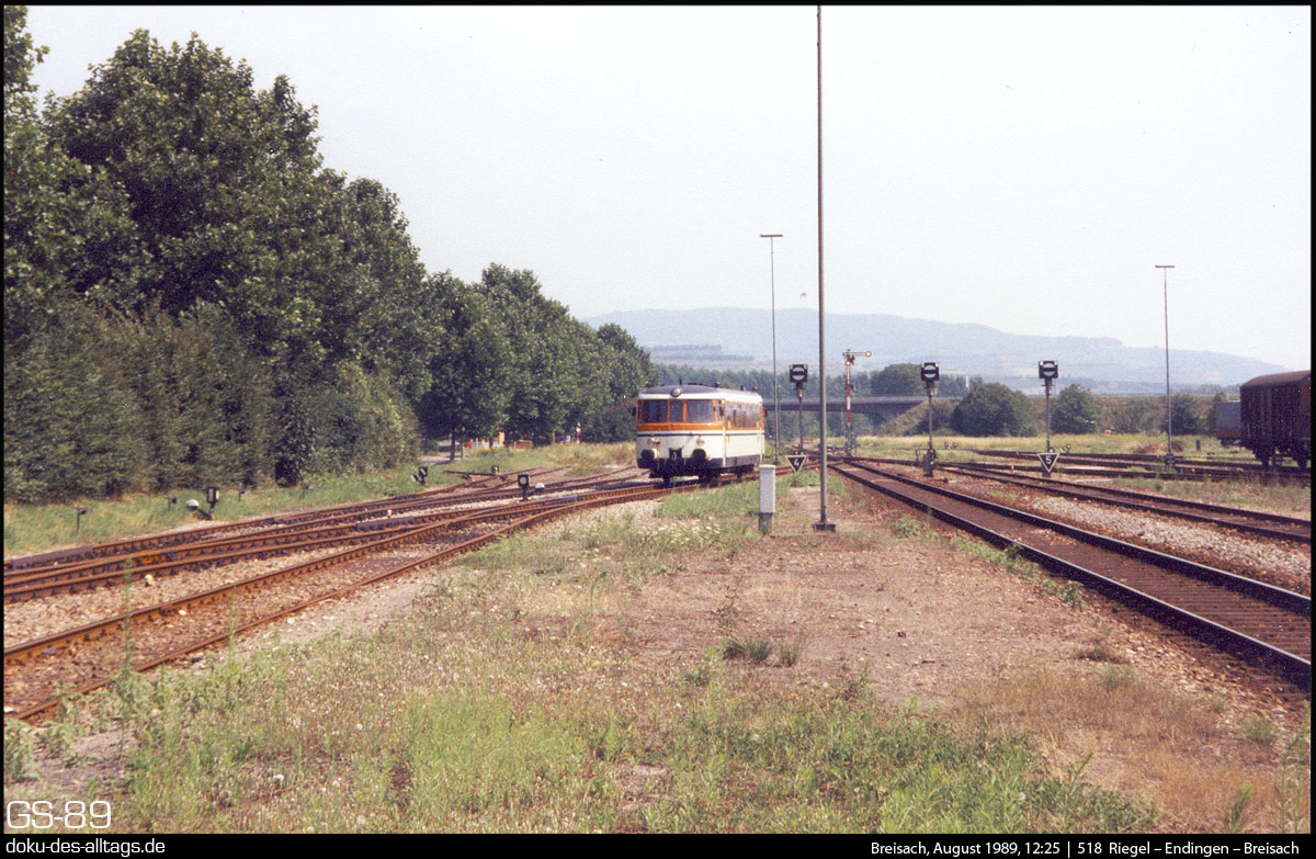 | Die Kilometrierung der Strecke beginnt zwar in Riegel, aber die Tour im Sommer 1989 erfolgte in der Gegenrichtung. Dementsprechend die folgende Beschreibung der Fahrt. Der Fahrplan war damals eher mager. Ab Breisach startete werktags der erste Zug nach Endingen um 7:35. Der nächste folgte um 12:33 (bis Riegel). Dann einer um 13:24 bis Endingen, allerdings nur an Schultagen. Es fuhren dann noch zwei Züge ab, um 17:08 nach Endingen und um 18:22 nach Riegel. Mehr Zugleistungen gab es zwischen Jechtingen und Endingen bzw. Riegel, v. a. zum Berufsverkehr. In der Gegenrichtung sah es ähnlich aus. Den Museumsdampfzug "Rebenbummler" an bestimmten Tagen gab es auch schon. |