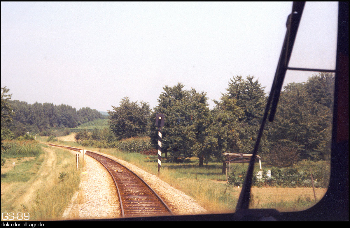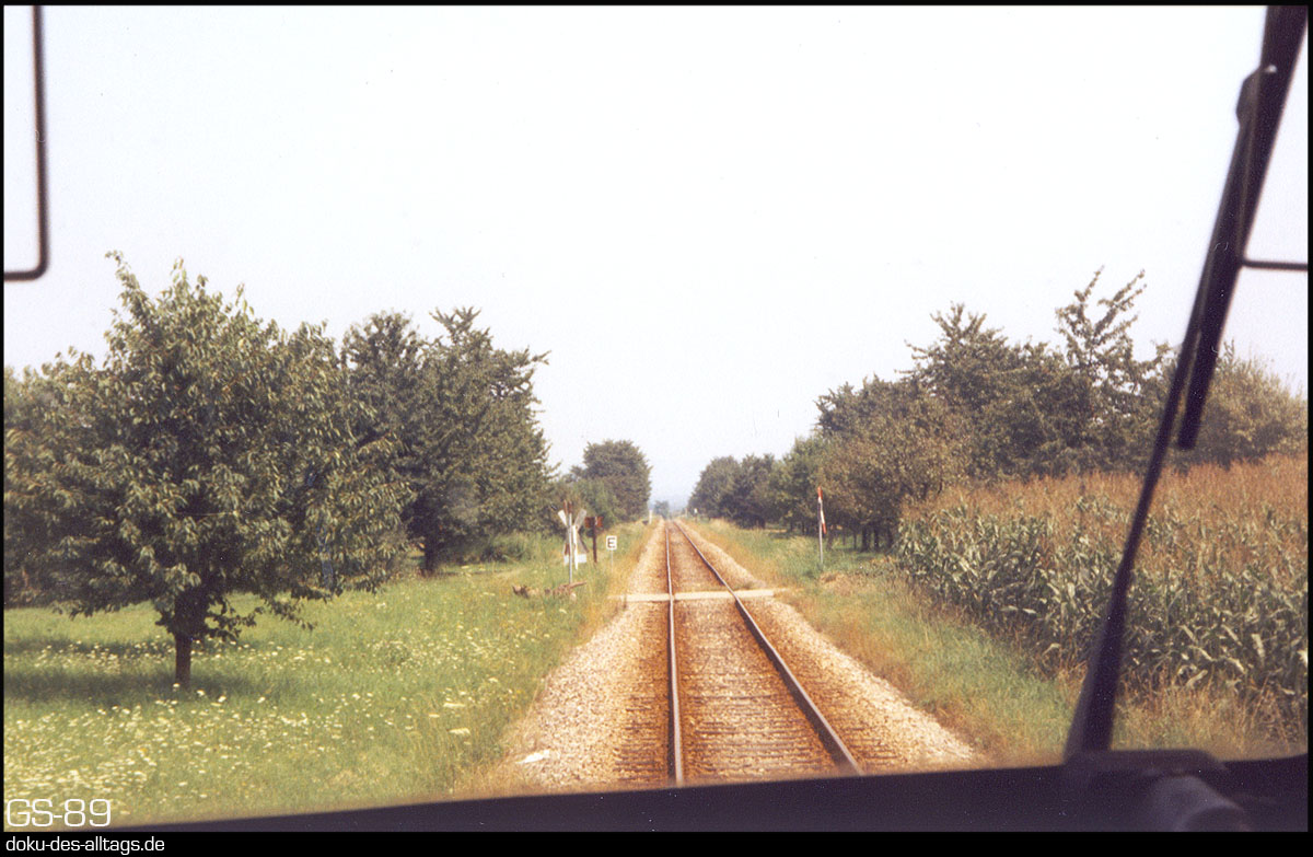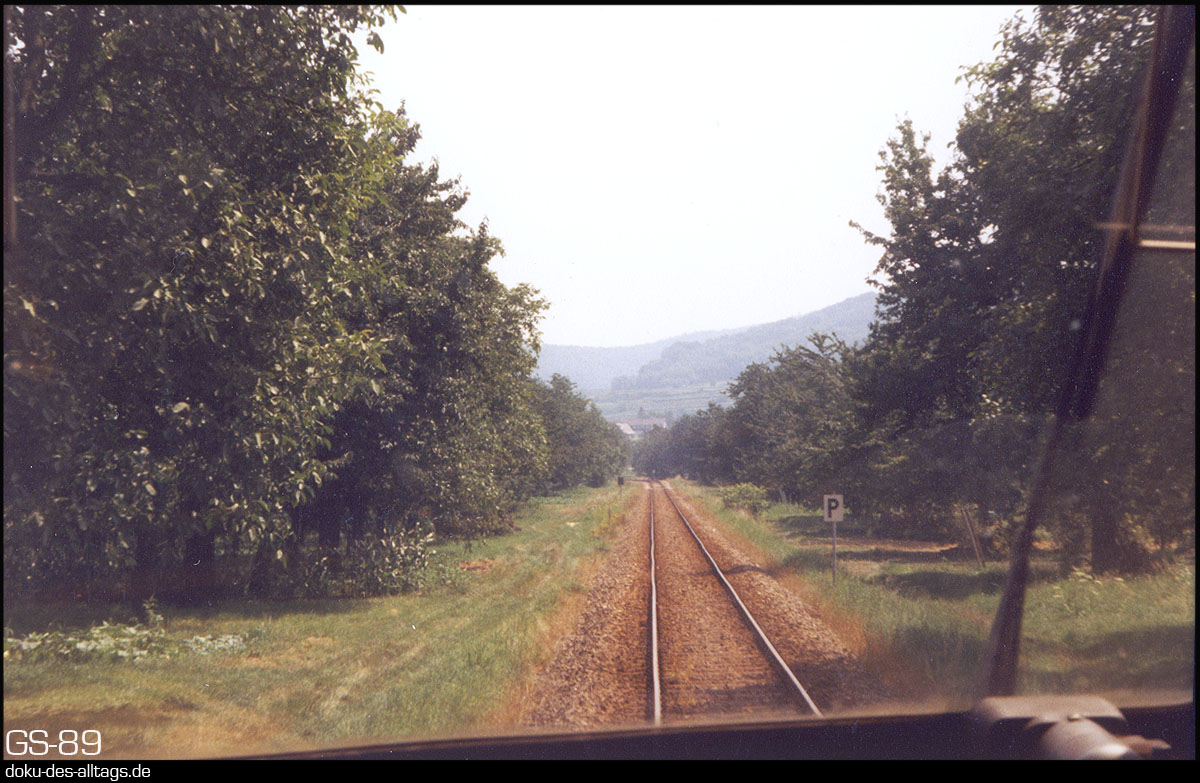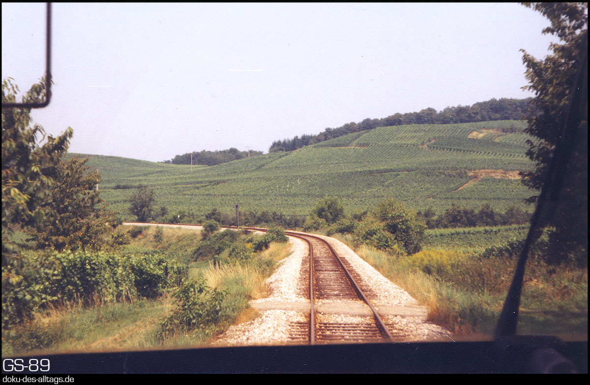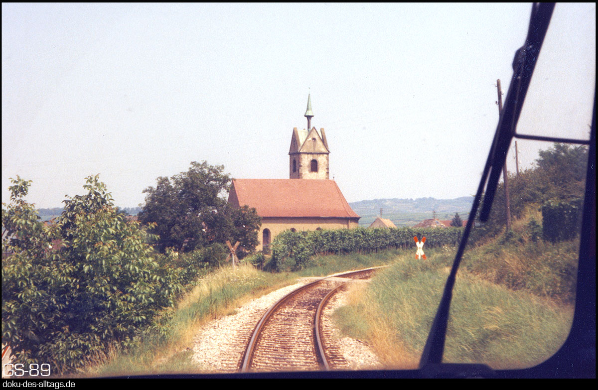 | 10.) Der Triebwagen lässt Breisach hinter sich. Gleich nach Verlassen des Bahnhofs zweigt die Kaiserstuhlbahn ab, und führt zwischen Rhein und den Höhenzügen des Kaiserstuhls nordwärts bis Sasbach (Rhein). Nun geht es zwischen Weinbergen und Obstgärten dem ersten Halt Achkarren entgegen. Die Strecke ist 25,9 km lang, die Kilometrierung beginnt in Riegel an der Hauptstrecke Offenburg Basel. |