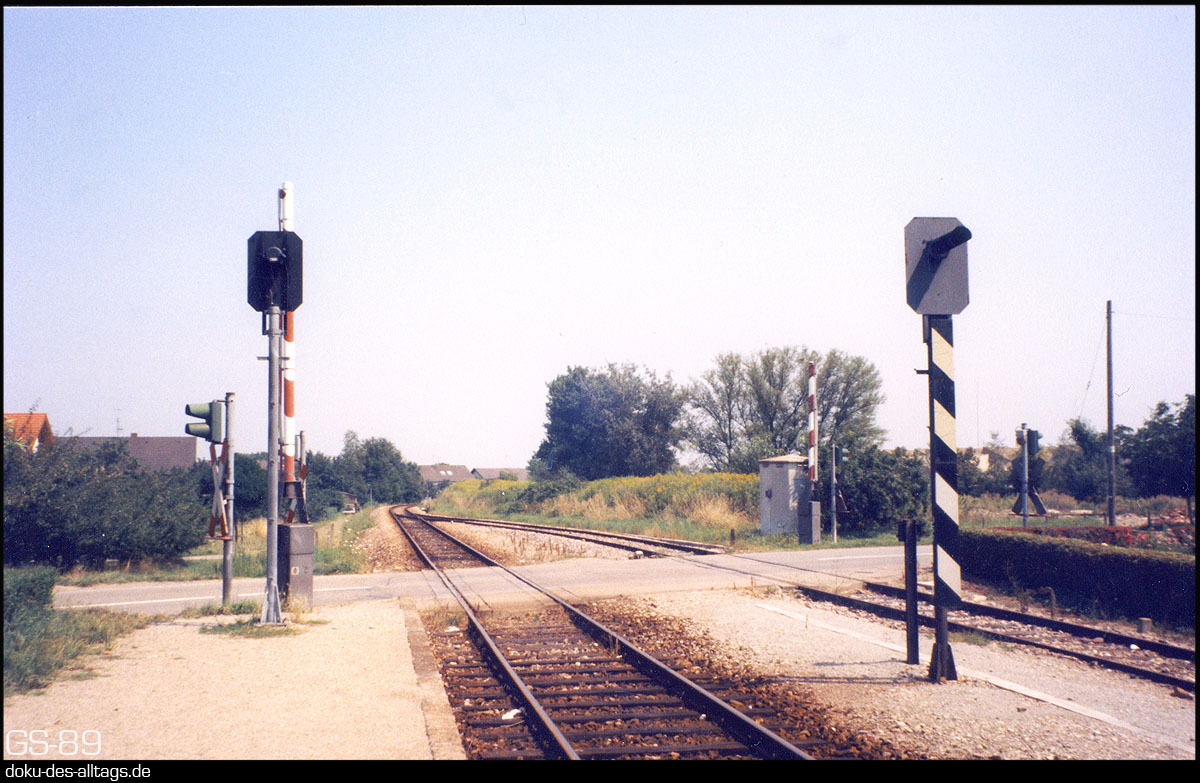 | 12.) Rückblick ins mittägliche Gegenlicht, das die Beschaulichkeit der Station noch verstärkt. Die zahlreichen mit Blinklichtern ausgestatteten Bahnübergänge werden von vereinfachten BÜ-Signalen angezeigt. |