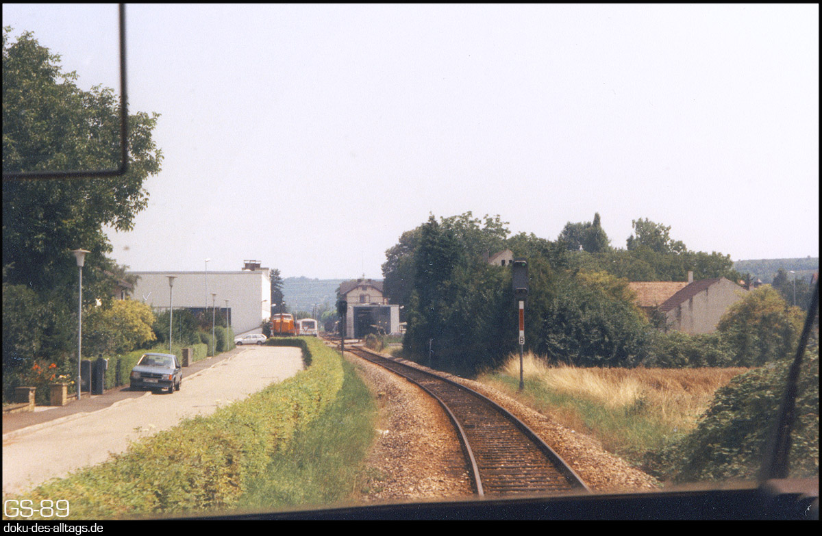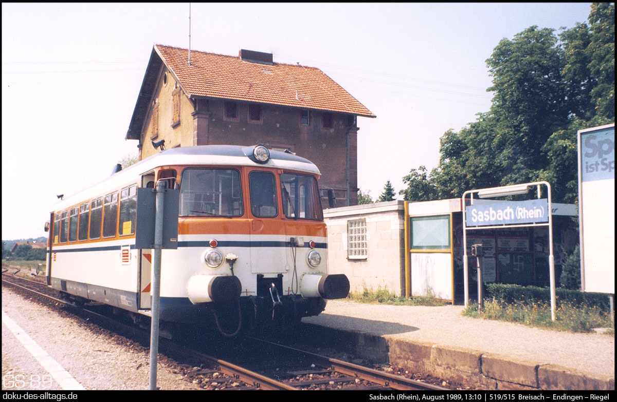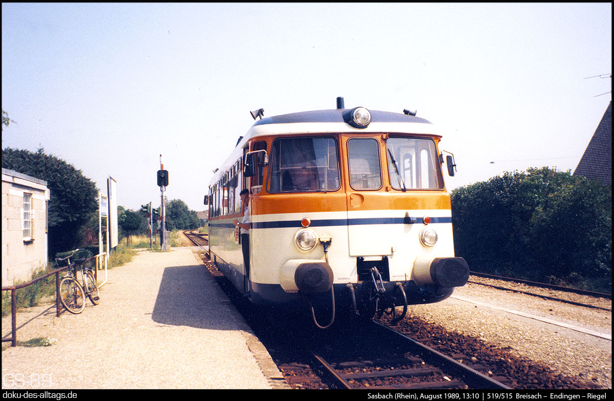 | 17.) Nun ist Sasbach (km 12,2) erreicht, wo planmäßig ein längerer Halt ansteht, aber keine Zugkreuzung. Trotzdem wurden die Motoren abgestellt. Sasbach (Rhein) wurde irgendwann in den darauffolgenden Jahren in Sasbach am Kaiserstuhl umbenamt. |