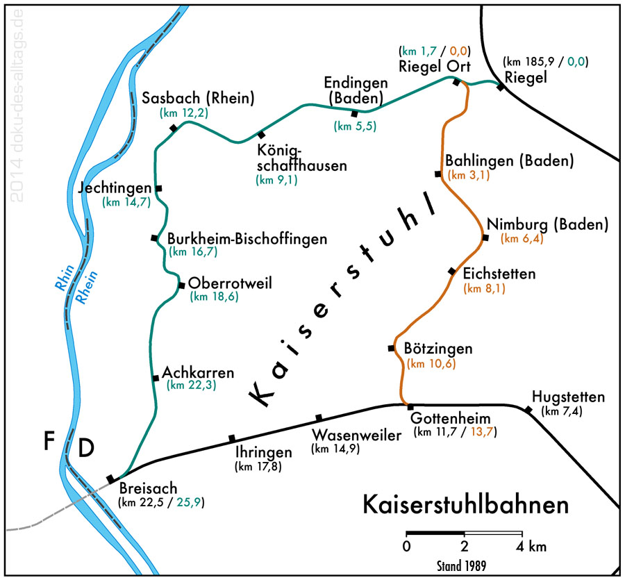 | Übersichtskarte der Bahnstrecken rund um den Kaiserstuhl, Zustand 1989. Bei der Strecke Riegel Ort Gottenheim kam später beim km 4,2 der neue Haltepunkt Bahlingen-Riedlen sowie am km 9,7 der neue Haltepunkt Bötzingen Mühle hinzu.
