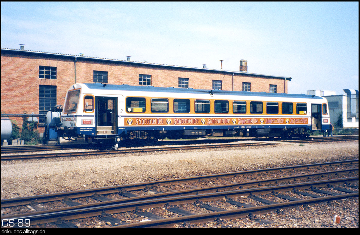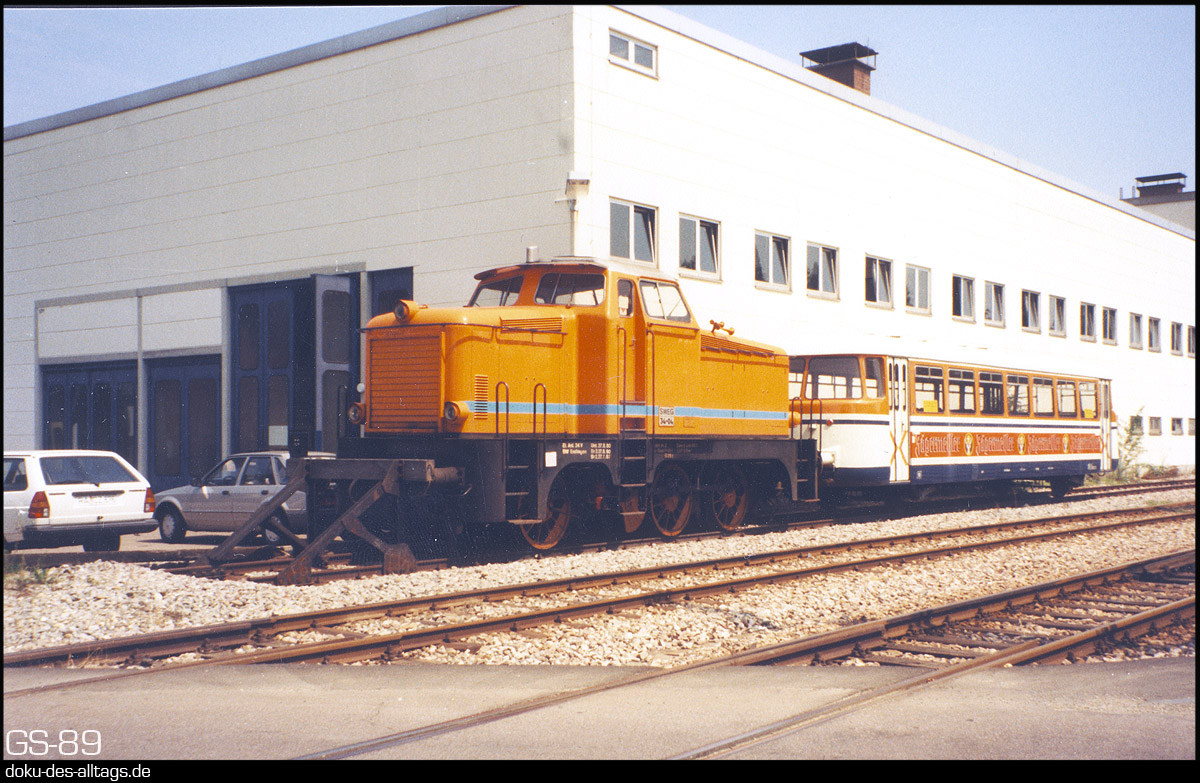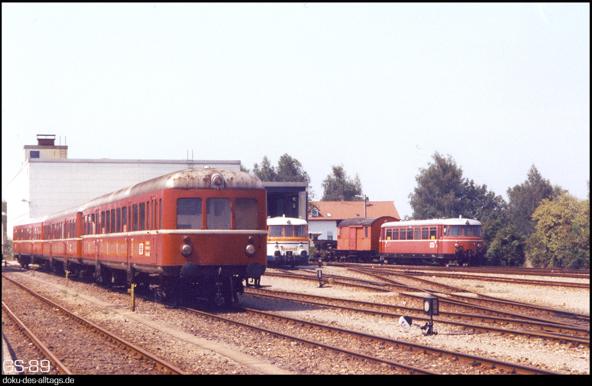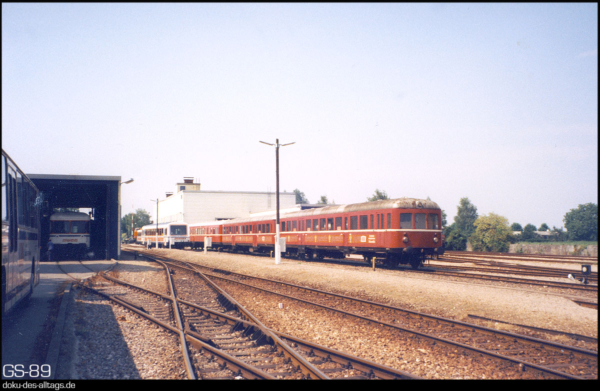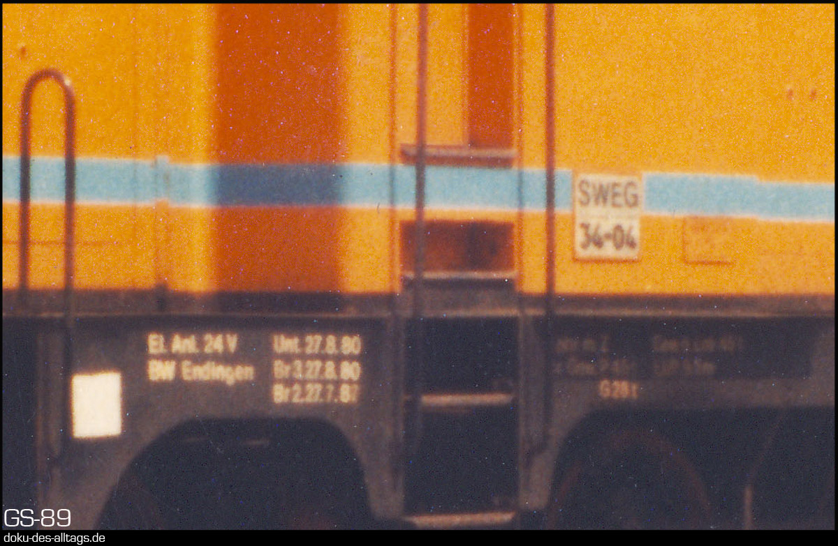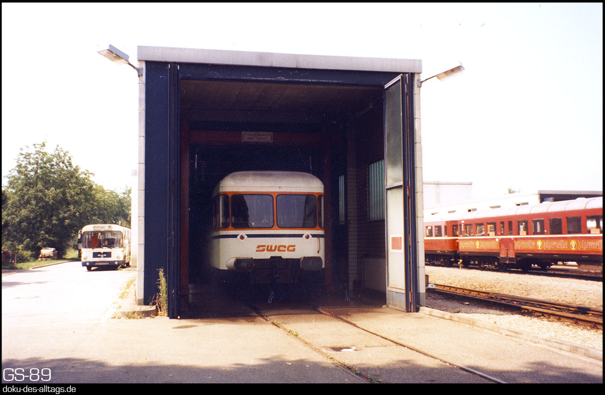 | 27.) Bei den drei Esslingern handelt es sich meines Wissens um ehemalige VT, die zu VB rückgebaut wurden und bei der SWEG für den Schülerverkehr eingesetzt wurden. Nummern sind mir nur von zweien bekannt: VB 236 (ex SWEG VT 111, ex AKN VT6) VB 238 (ex SWEG VT 109, ex AKN VT8) Der noch rot lackierte MAN-Steuerwagen im Hintergrund ist der VS 111 ohne Fronttür. |