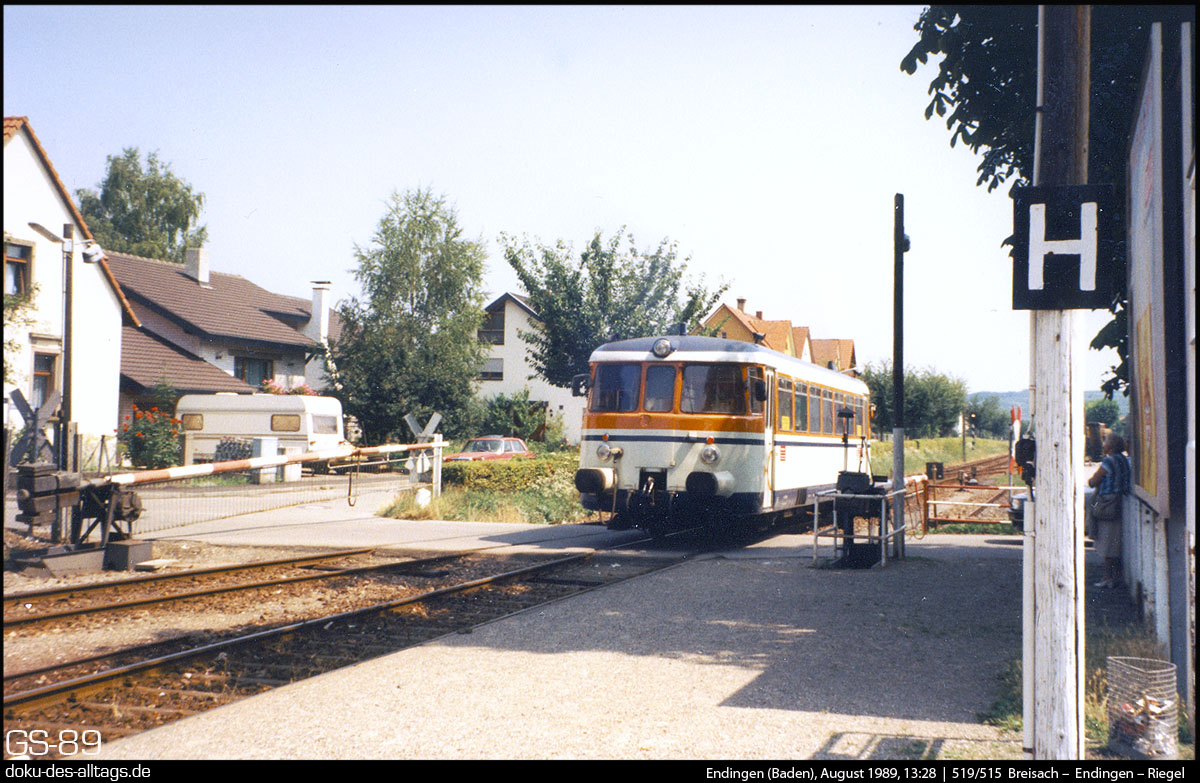 | 23.) Nach kurzem Aufenthalt werden die Schranken heruntergekurbelt und der MAN-Schienenbus brummt weiter nach Riegel Ort, wo die weitere Kaiserstuhlbahn nach Gottenheim abzweigt und wird um 13:37 den DB-Bahnhof Riegel erreichen. | |||