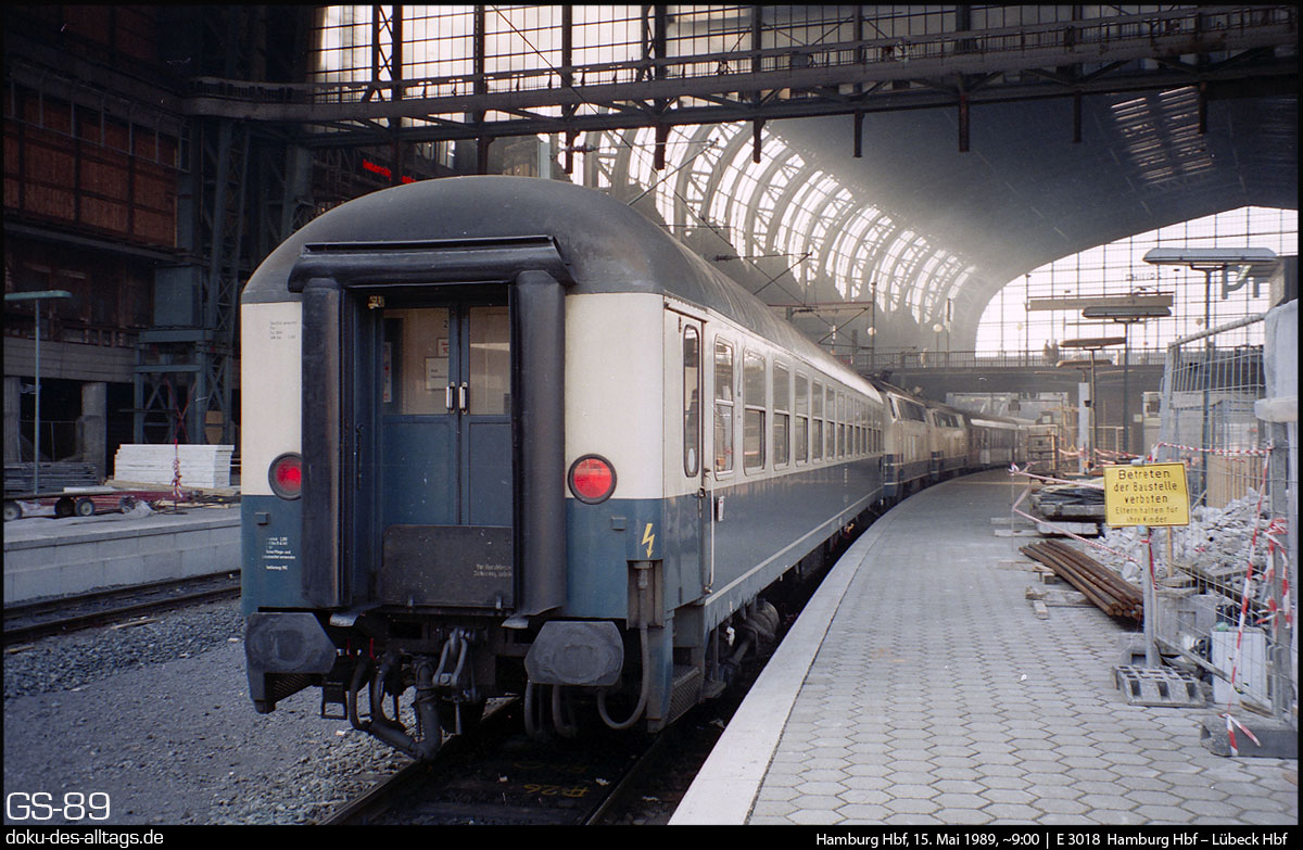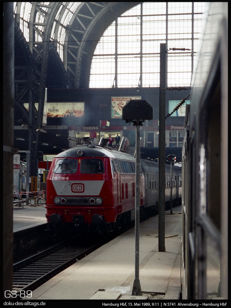 | 2.) Blick aus dem Zugfenster des E 3018 kurz vor der Abfahrt nach Lübeck. Daneben fährt Pielstick-218 336 ein mit dem N 5741, der an Sonn- und Feiertagen aus Ahrensburg kommt. Werktags gibt es stattdessen den N 5841 aus Bad Oldesloe. 218 336 wurde 18 Tage vorher, am 27.04.1989 orientrot lackiert. | ||||||