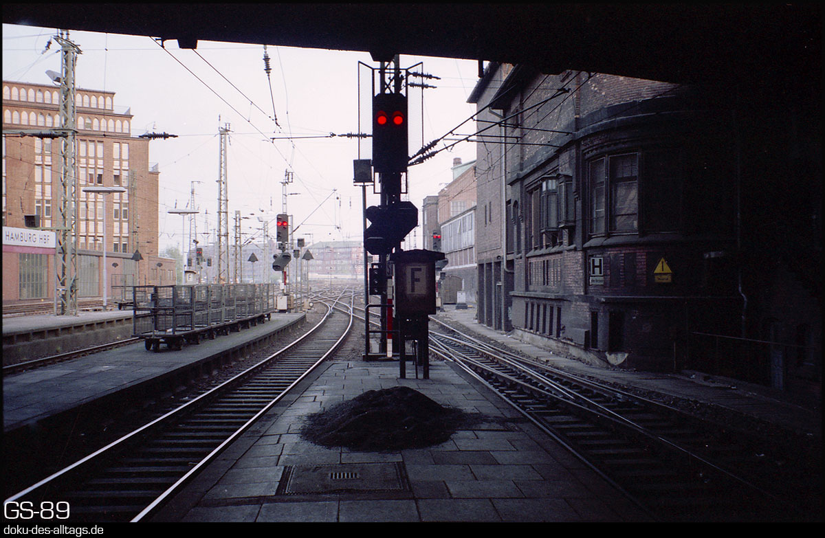 | 7.) Die Ausfahrt Richtung Harburg, bzw. Hauptgüterbahnhof. Rechts das ehemalige Stellwerk Hs, das bis zum 10. September 1949 in Betrieb war. | ||||||