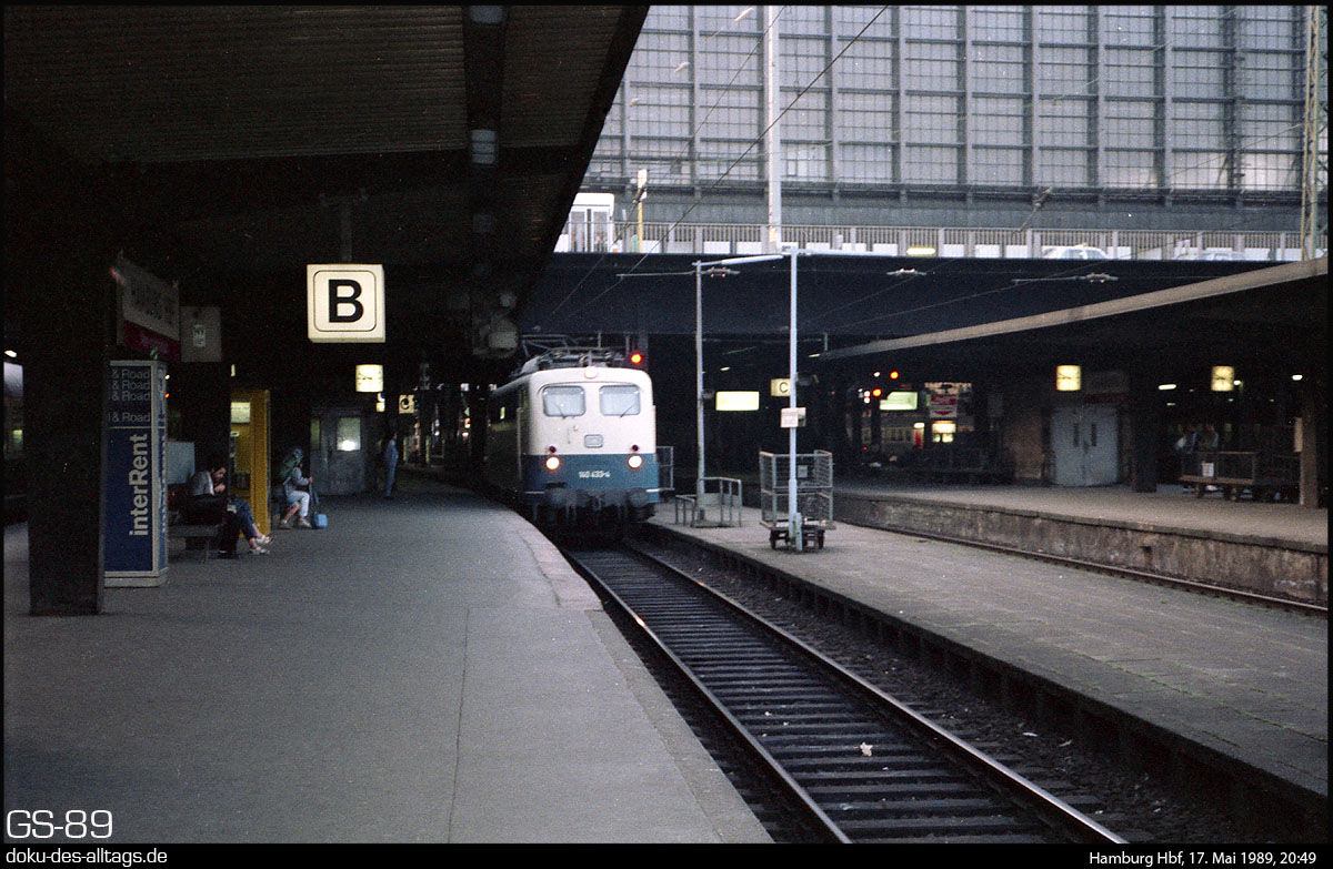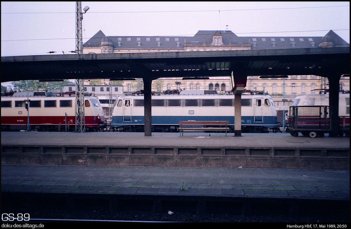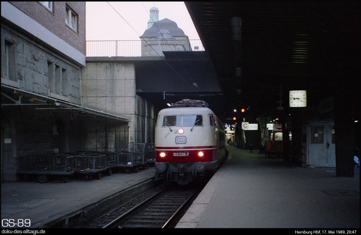 | 9.) Unmittelbar nach der Abfahrt des Eilzuges wird Gleis 14 schon wieder belegt. 103 226 fährt ein. Dabei könnte es sich zum einen um den D 1283 nach Innsbruck, aber auch um den IC 736 "Alster-Kurier" nach Bremen handeln. Beide Züge verlassen Hamburg Hbf um 20:50. | ||||||