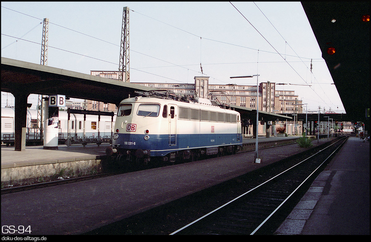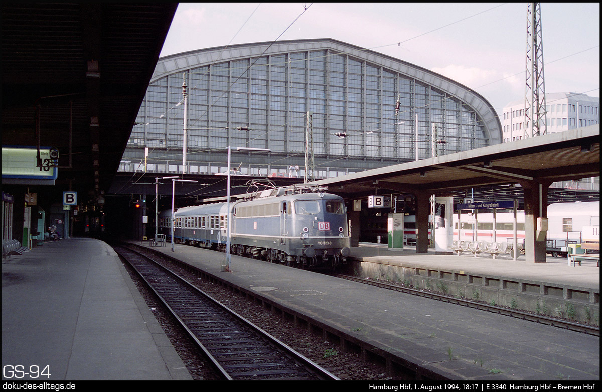 | 12.) Zur Abwechslung zwei Bilder von 1994. 110 323 verlässt um 18:17 den Hauptbahnhof von Gleis 12 mit einem Eilzug nach Bremen. Links entschwindet gerade der IR 2172 Konstanz Hamburg-Altona. |