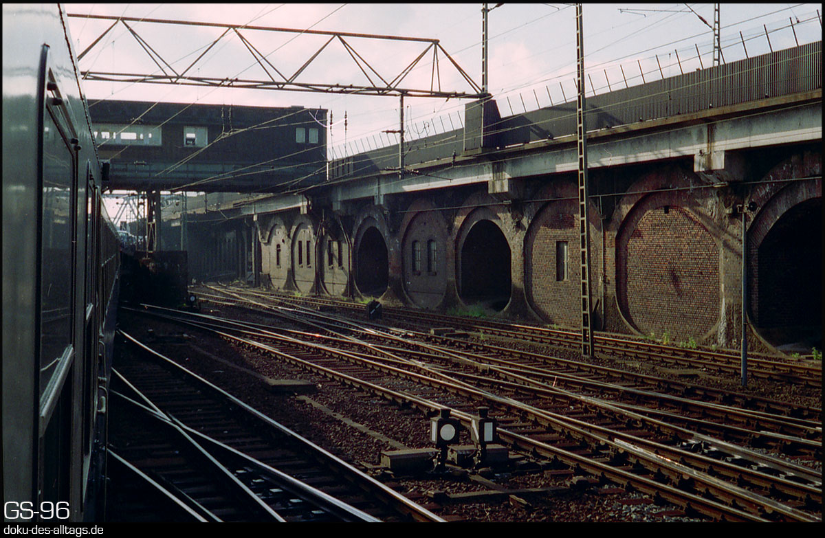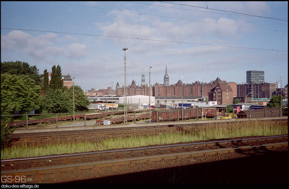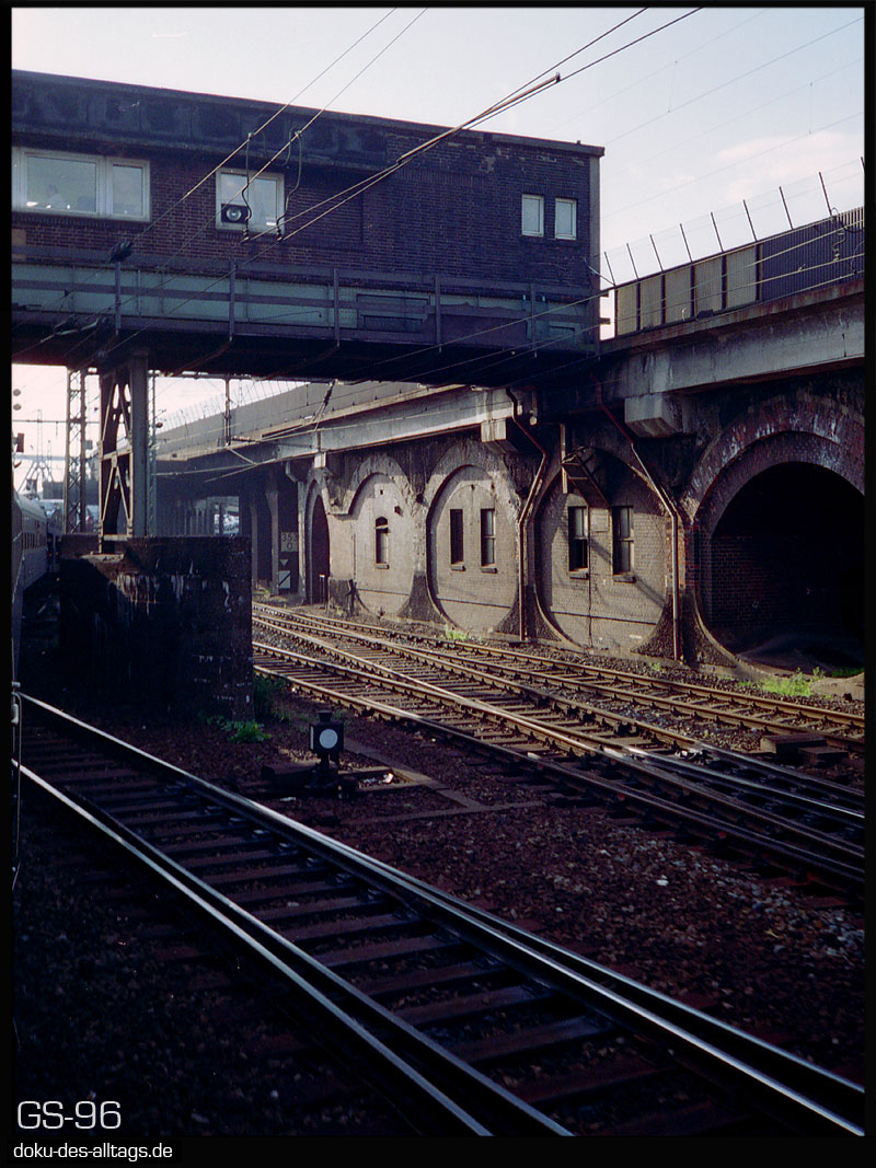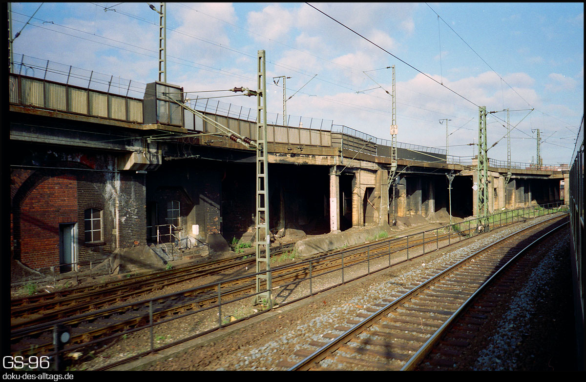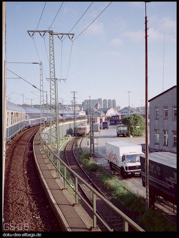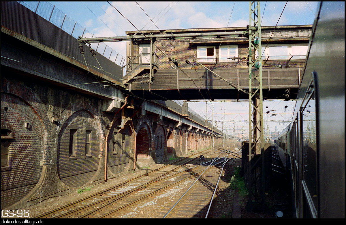 | Kurz bevor die Hauptstrecke von Hamburg-Harburg den Hamburger Hauptbahnhof erreicht, wird der Hauptgüterbahnhof auf dem Großen Grasbrook durchquert. Regulär fahren die Reisezüge über die sogenannte Pfeilerbahn eine Etage höher, aber 1996 kam ich in den Genuß, mit dem Autoreisezug direkt durch den Güterbahnhof zu fahren. | ||||||||||||