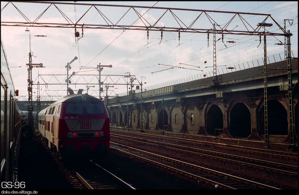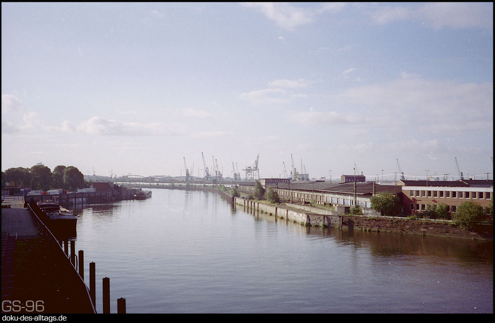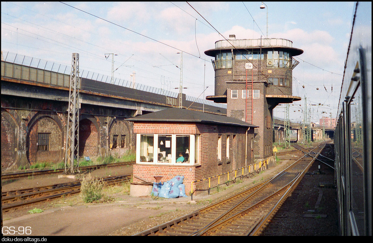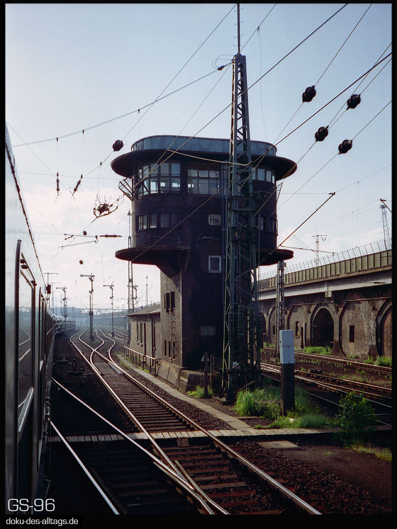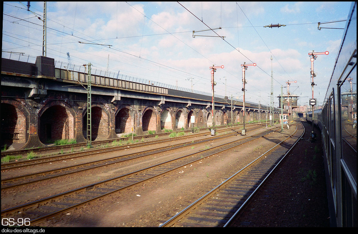 | Kurz bevor die Hauptstrecke von Hamburg-Harburg den Hamburger Hauptbahnhof erreicht, wird der Hauptgüterbahnhof auf dem Großen Grasbrook durchquert. Regulär fahren die Reisezüge über die sogenannte Pfeilerbahn eine Etage höher, aber 1996 kam ich in den Genuß, mit dem Autoreisezug direkt durch den Güterbahnhof zu fahren. | ||||||||||||