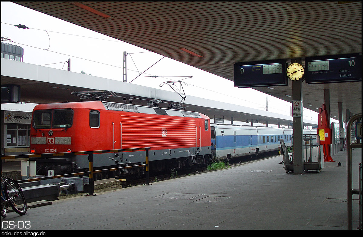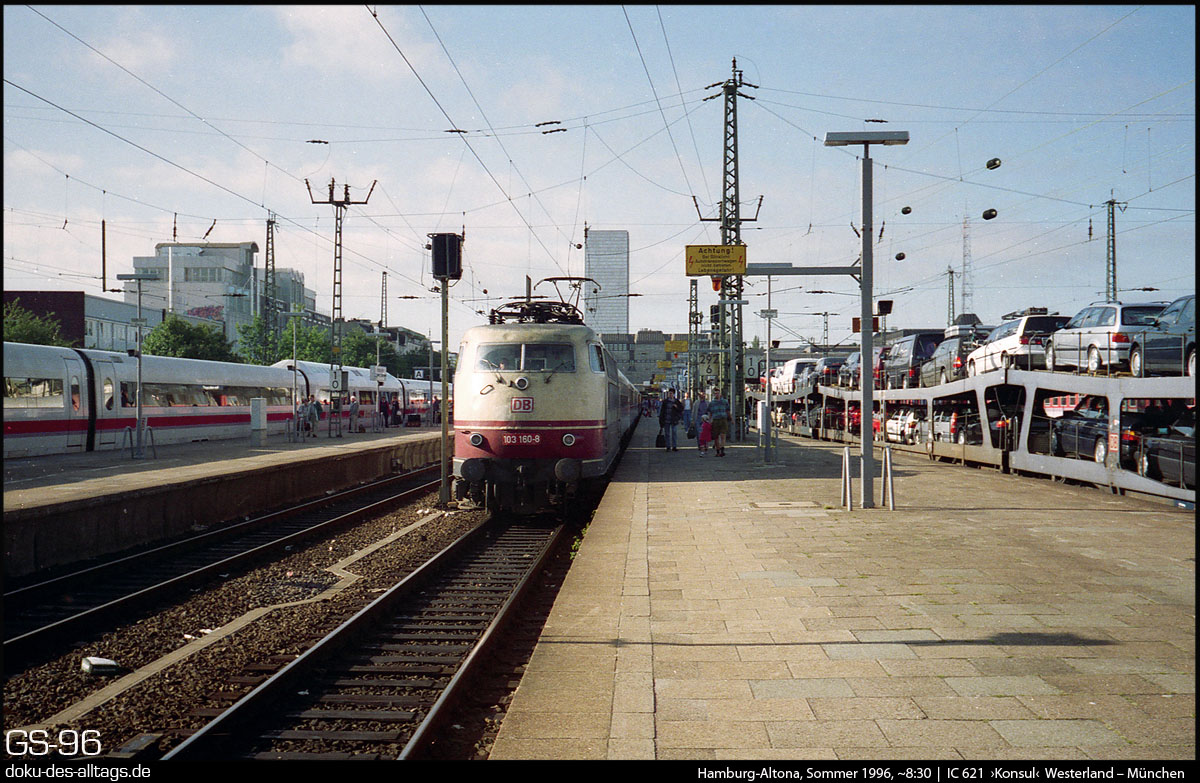 | 1.) 103 160 steht zur Abfahrt nach München über Bremen Dortmund Köln bereit. Rechts auf Gleis 9 ist gerade der D 1988 ›Meteor‹ aus München Ost angekommen. Der ICE links könnte der ICE 585 nach Garmisch-Partenkirchen sein. | |||||