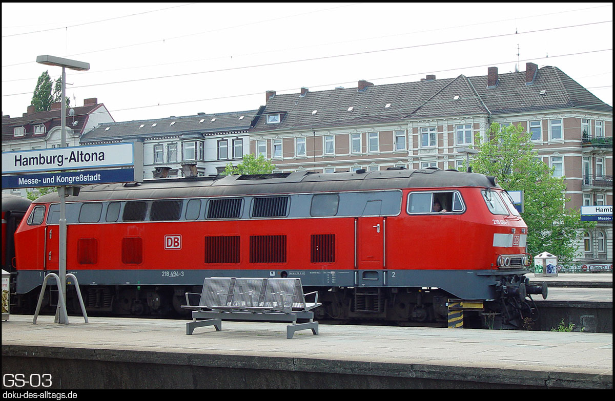 | 7.) 218 119 dieselt mit dem Zug nordwärts. Links fällt der Blick in die verwinkelten Straßenzüge von Ottensen. | |||||
