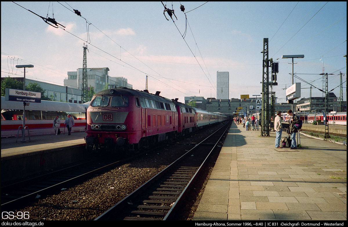 | 3.) Nun ist der Blick frei auf Gleis 11 wo ein 218-Doppel mit 218 337 voran mit dem IC Deichgraf auf die Abfahrt um 8:46 wartet. | |||||