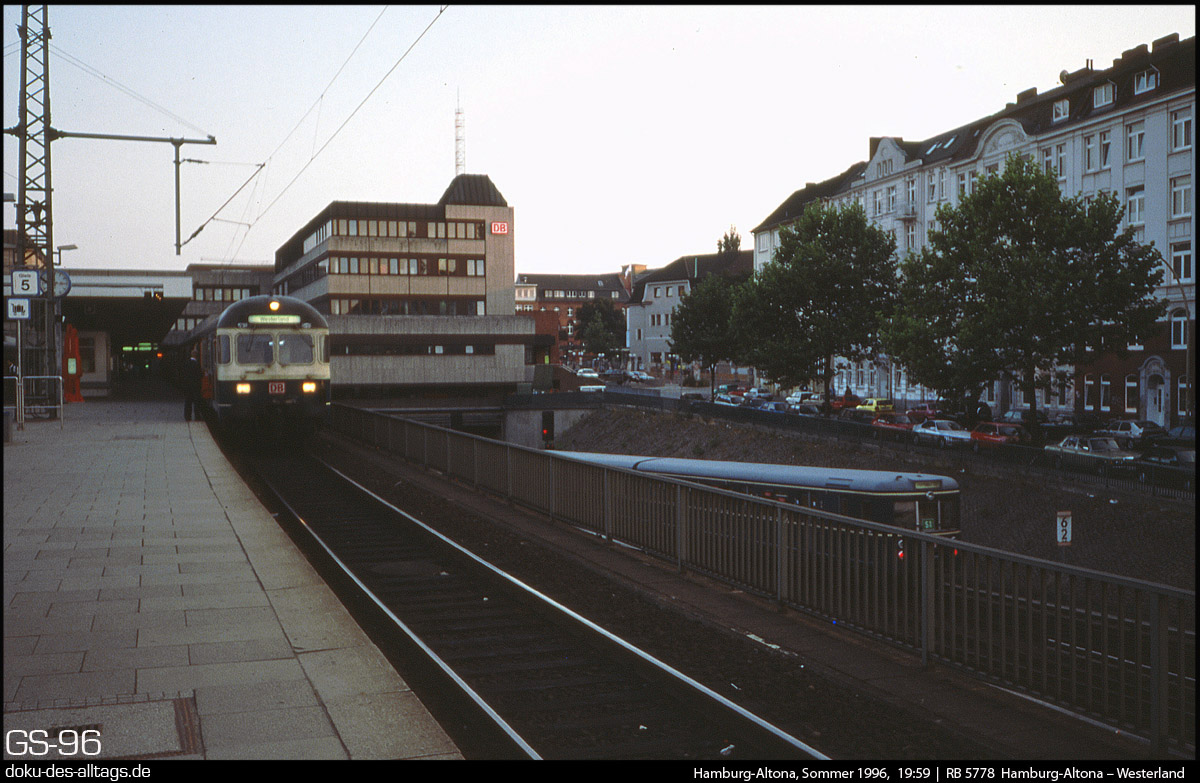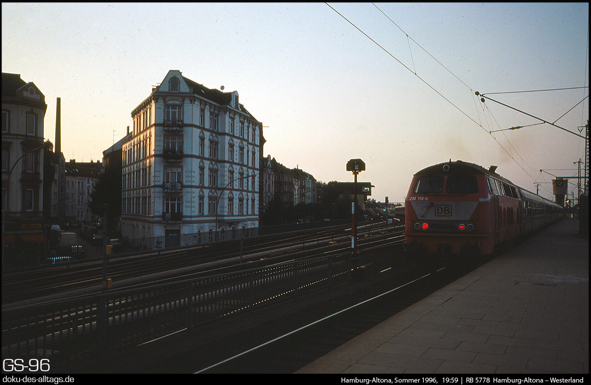 | 6.) Sommerabend auf Gleis 5 (welches 1989 noch Gleis 4 hieß). Ein Wendezug nach Westerland ist kurz vor der Abfahrt. | |||||