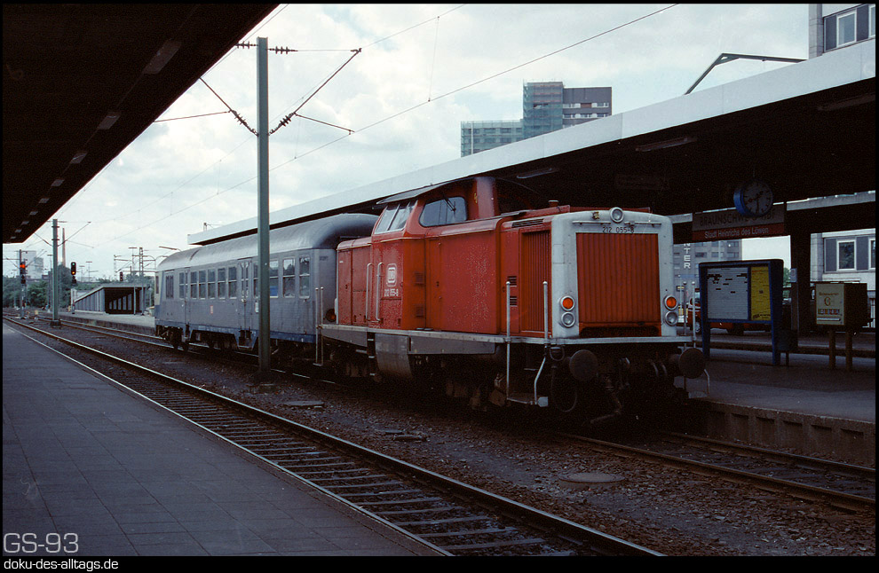 | 23.) Dies ist tatsächlich mein einziges Bild aus dem Braunschweiger Hbf. Es entstand am selben Tag, deshalb hänge ich es hier mit an. 212 055 mit einem sehr kurzen Wendezug in Braunschweig. Um halb 2 schiebt sie diesen als N 8218 nach Salzgitter-Lebenstedt. | ||||||||
