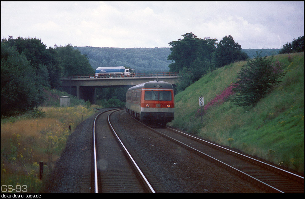 | 13.) Begegnung mit dem orangen 614 048 bei Bad Gandersheim etwa einen Monat zuvor. Der ursprünglich Nürnberger Triebzug kam 1993 zum Bw Braunschweig. 1996 wurde er mintgrün lackiert. Hier ist er als E 6014 von Wolfsburg nach Kreiensen unterwegs. | ||||||||