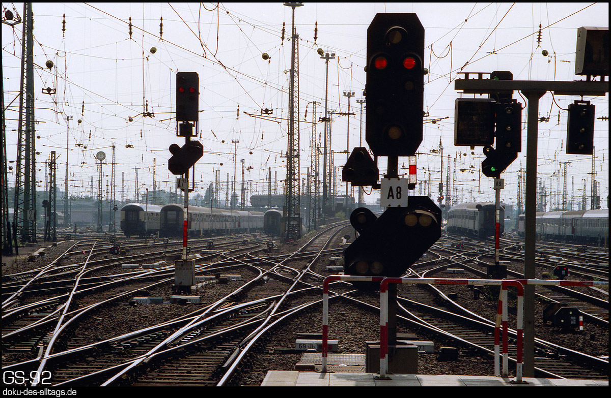 | 2.) Das dichte Netz der Weichenverbindungen im Vorfeld, von Gleis 8/9 aus gesehen. Auf kurzer Distanz trennen sich Strecken in alle Richtungen. Bis zur Inbetriebnahme des ESTW 2005 standen zum Großteil noch die Signale mit den alten Schirmen, die zusammen mit dem Zentralstellwerk 1957 in Betrieb gingen. So auch dieses verkürzte am Gleis 8, flankiert allerdings von zweien neuerer Bauart. Die Gleise 8 und 9 münden direkt in die Streckengleise nach Offenbach und Darmstadt über Neu Isenburg. Die viergleisige Trasse steigt über eine Rampe an, schwenkt dann nach Süden und überquert zuerst die Gleise nach Ffm-Sportfeld und Wiesbaden und dann den Main. Danach trennen sich die beiden Streckenäste nach Osten und Süden. Der ICE Kurpfalz hat bereits Hp 2 und auf dem Offenbacher Gleis kommt gerade ein Zug angefahren. |