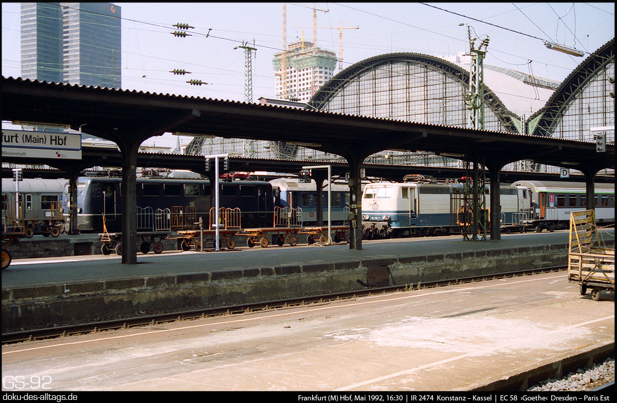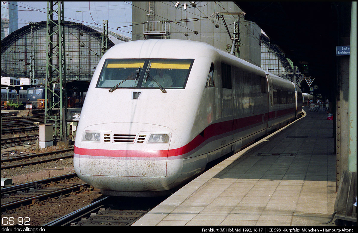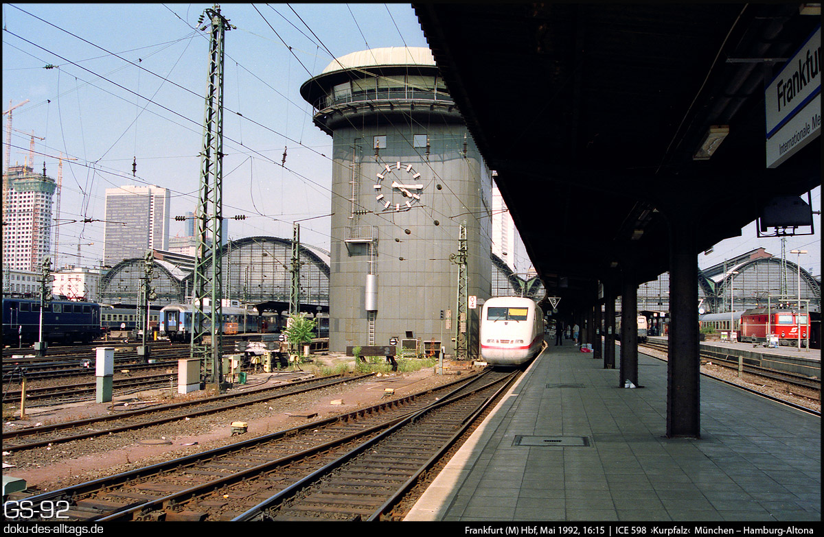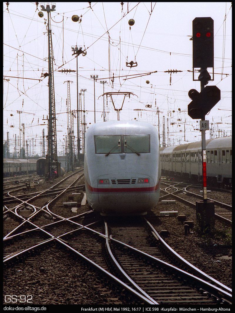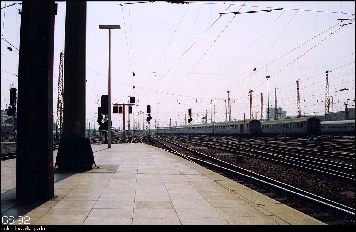 | 1.) Auf Gleis 9 selbst steht nun 401 011 als ICE 598 Kurpfalz München Hamburg. Bis zur Abfahrt vergeht noch eine Minute. Mit 15 anderen ICE-Paaren steht der Kurpfalz in der 1992 noch im Kursbuch vorhandenen Liste mit den schnellsten Zügen der Deutschen Bundesbahn ganz oben. Links sieht man mit etwas Verspätung den IR 2474 Konstanz Kassel einfahren. Auf der Weiterfahrt nach Kassel wird ihn 110 140 bespannen, die angeschnitten am linken Bildrand zu sehen ist. Die Interregio-Linie 19 gab es von 1989 bis 2002 Rechts auf Gleis 6 steht eine 1044 der ÖBB. Diese hat den EC 129 Anton Bruckner Hamburg-Altona (ab 9:38) Köln Linz (an 22:07) am Haken. |