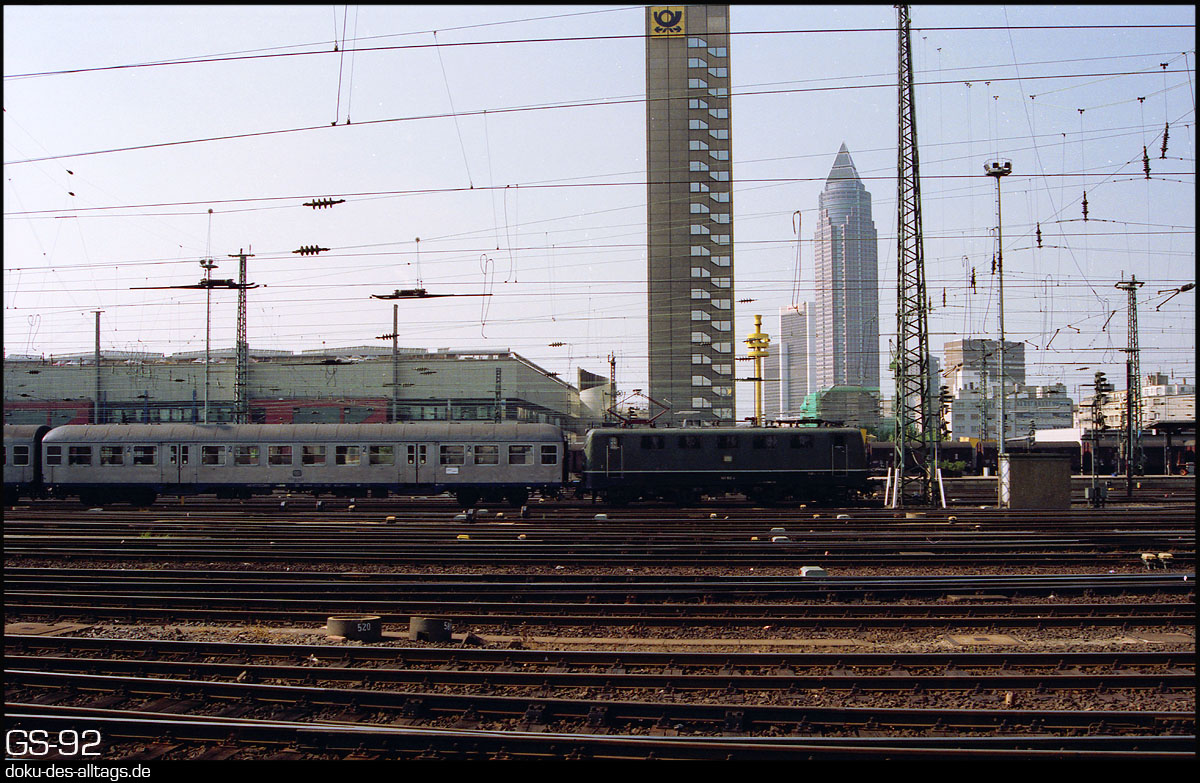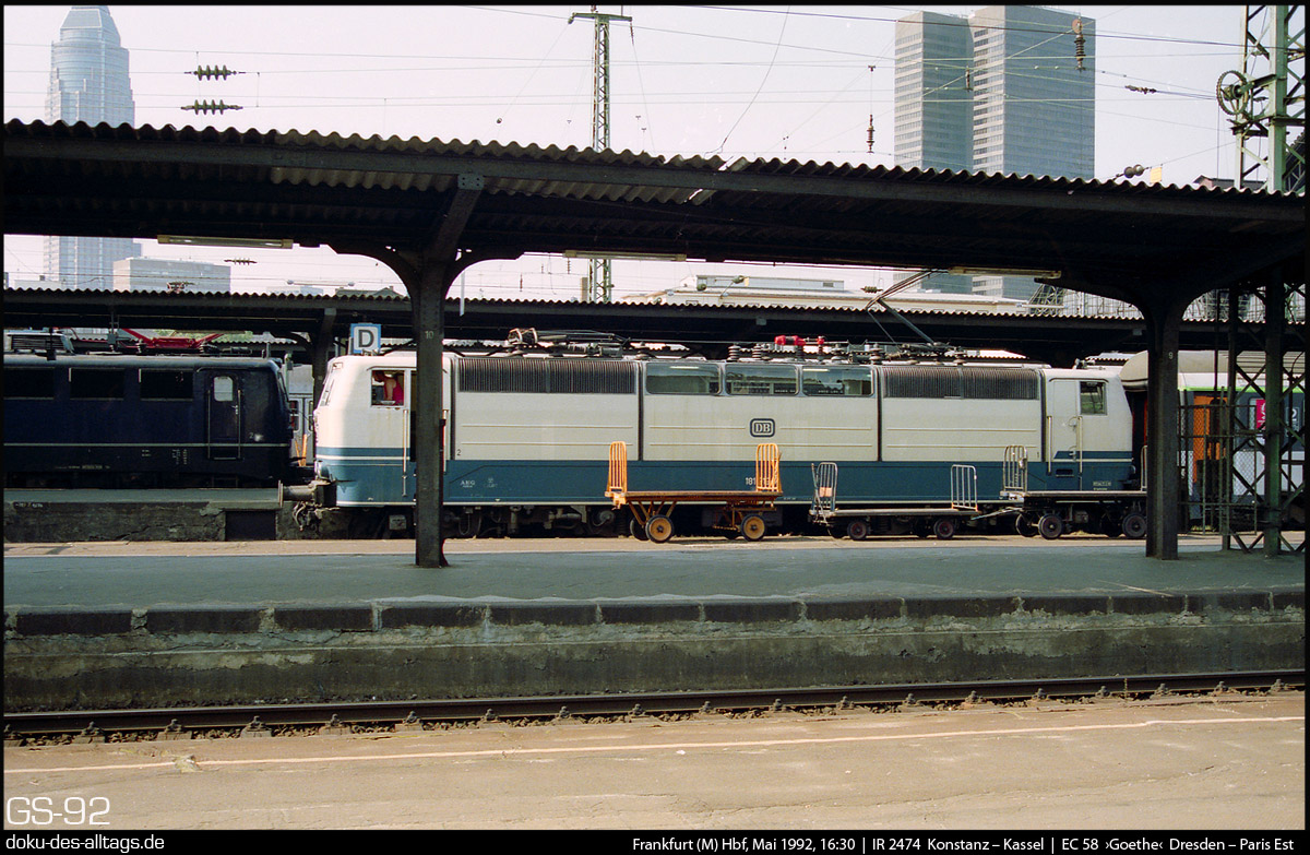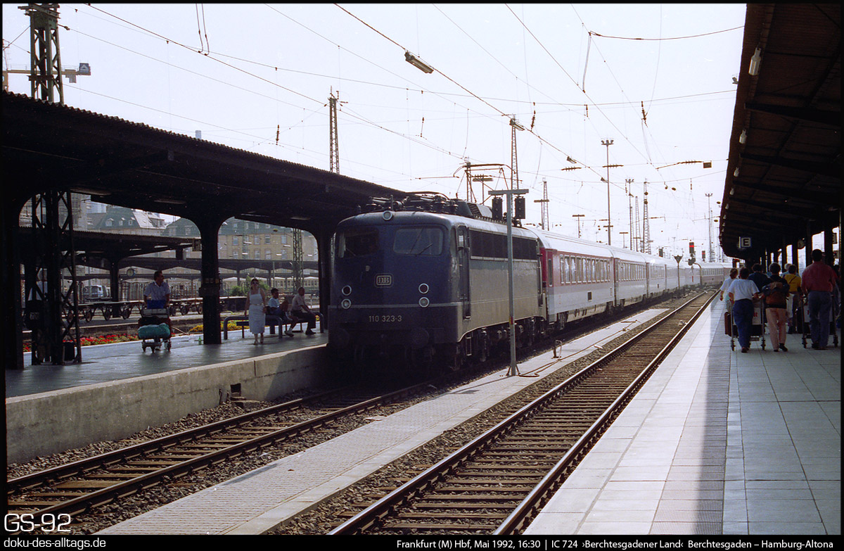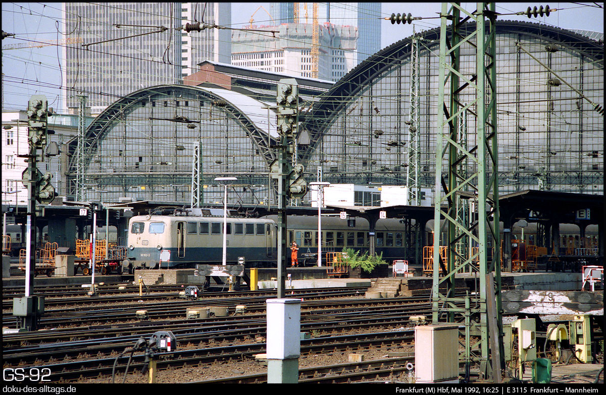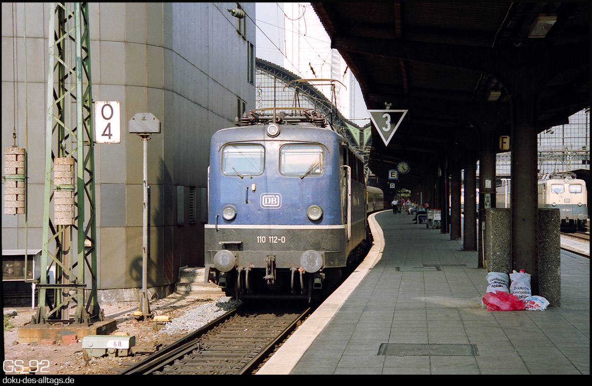 | 1.) Auf Gleis 9 selbst steht nun 401 011 als ICE 598 Kurpfalz München Hamburg. Bis zur Abfahrt vergeht noch eine Minute. Mit 15 anderen ICE-Paaren steht der Kurpfalz in der 1992 noch im Kursbuch vorhandenen Liste mit den schnellsten Zügen der Deutschen Bundesbahn ganz oben. Links sieht man mit etwas Verspätung den IR 2474 Konstanz Kassel einfahren. Auf der Weiterfahrt nach Kassel wird ihn 110 140 bespannen, die angeschnitten am linken Bildrand zu sehen ist. Die Interregio-Linie 19 gab es von 1989 bis 2002 Rechts auf Gleis 6 steht eine 1044 der ÖBB. Diese hat den EC 129 Anton Bruckner Hamburg-Altona (ab 9:38) Köln Linz (an 22:07) am Haken. |