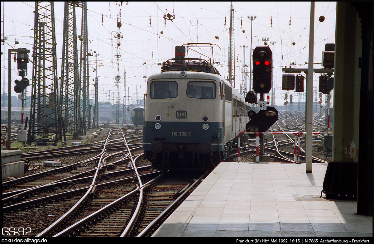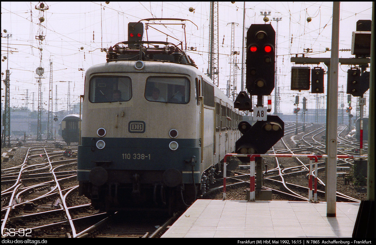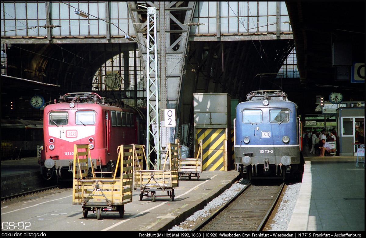 | 17.) Zweimal Zp 8 auf den Gleisen 9 und 10. Links wieder ein Wiesbaden City: 141 401 mit dem IC 920, Abfahrt nach Wiesbaden um 16:53. Links 110 112 mit dem N 7815 nach Aschaffenburg. | |||||