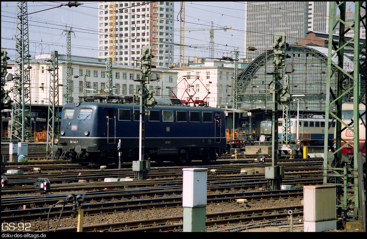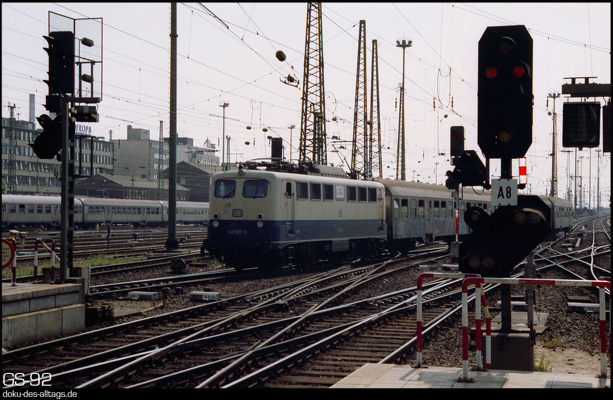 | 6.) Einfahrt von 140 607 ein. Sie ist zwei Jahre jünger als 110 338 auf Bild 39 und kam 1966 fabrikneu zum Bw Bebra an der Nord-Süd-Strecke, wo sie auch gegenwärtig noch beheimatet war. Im September 1992 kam sie zum Bw Frankfurt. Ihre dritte und letzte Umbeheimatung erfolgte 1999 zum Bh Mannheim. | |||||