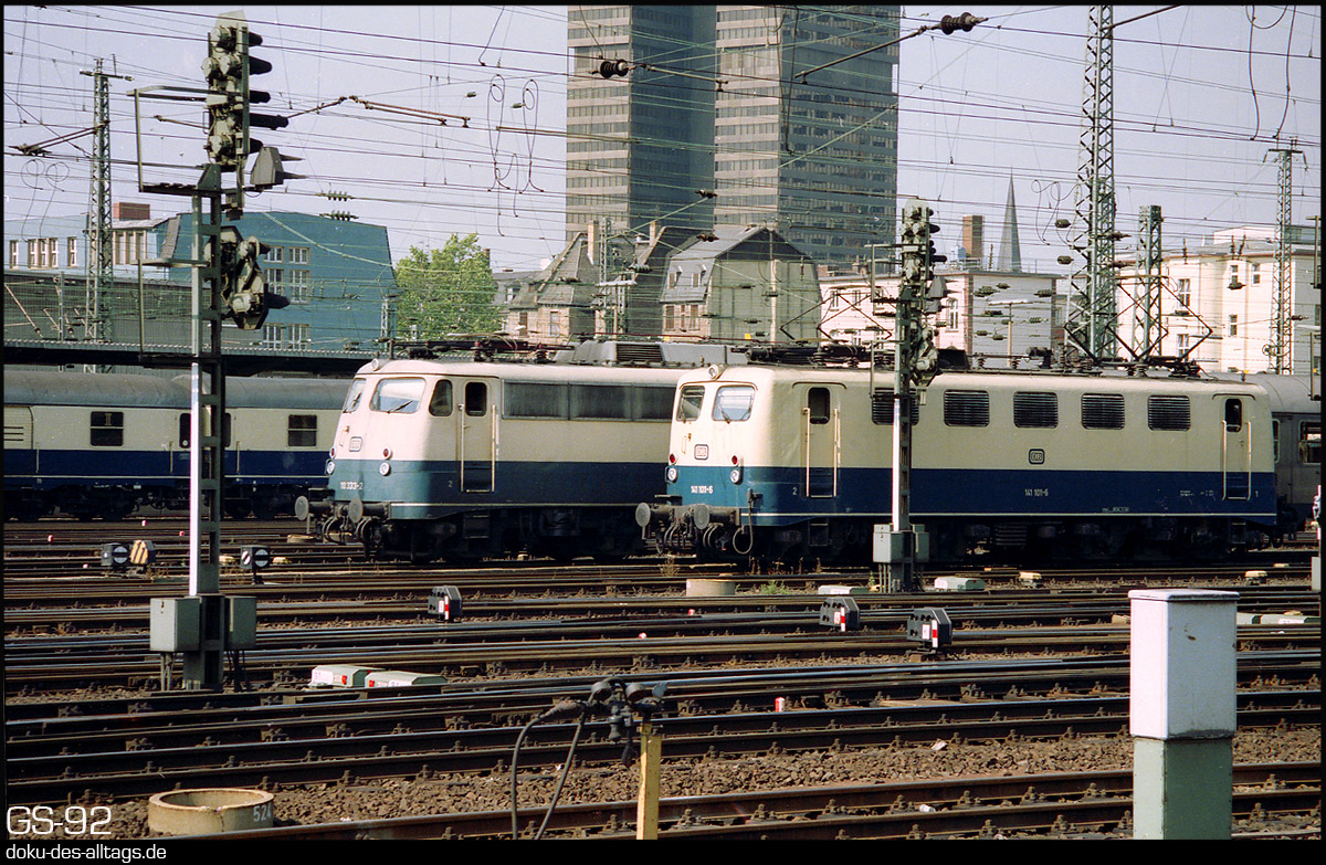 | 12.) Die mit dem E 3521 nach Mannheim (über Darmstadt) ausfahrende 110 333 neben der wartenden 141 101. Diese ist auch hier in Gießen zu sehen. Sie hatte nochmal waagrechte Lamellenlüfter der Bauart Schweiger erhalten, nachdem sie zuvor im grünen Anstrich schon mal senkrechte Lüftergitter besaß. Bis 11.07.1984 war sie grün lackiert, dann bis 24.09.1997 ozeanblau-beige. | |||||