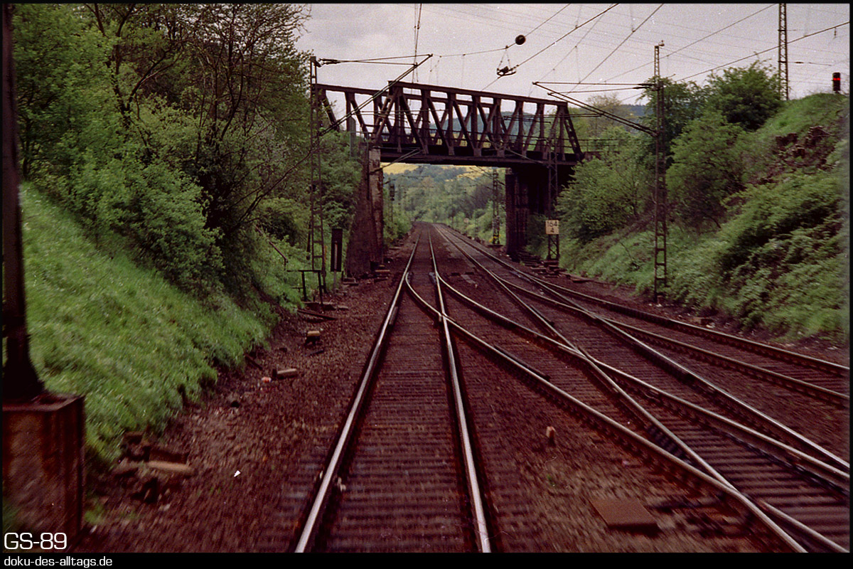 16.) Einfahrt in Bebra beim km 164,4. Auf der Brücke verläuft die Verbindungsstrecke zur Hauptbahn von nach Eisenach. Die Weichenverbindung unten bildet die Zufahrt zum Rangierbahnhof.