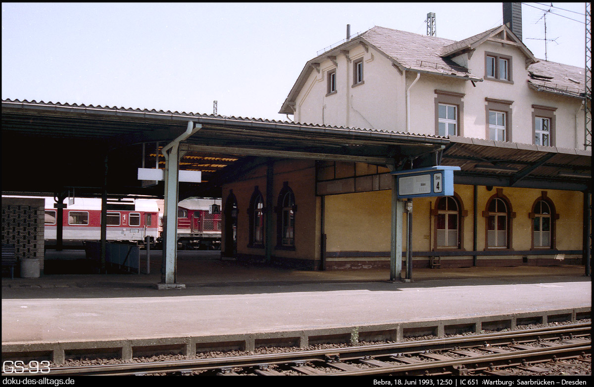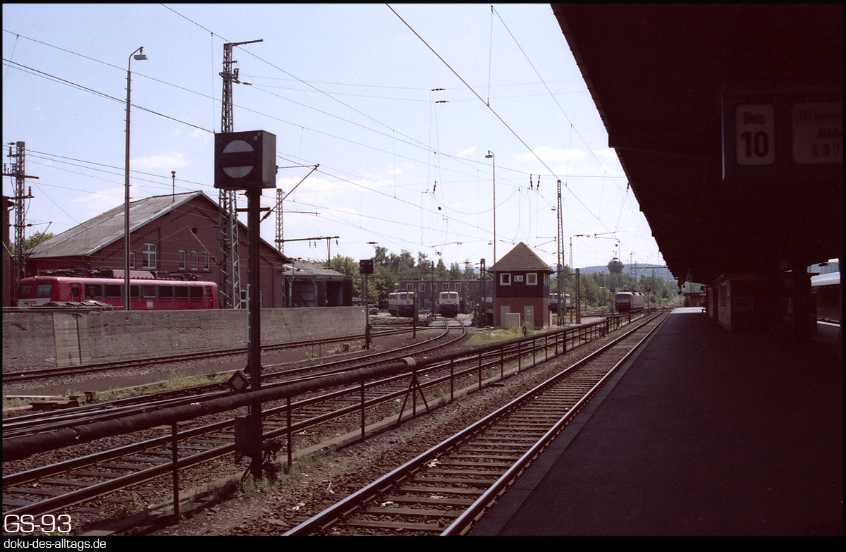 6.) Der Standort ist nun der südwestlich vom EG gelegene Bahnsteig von Gleis 1 und 2. Im Vordergrund ist Gleis 3 zu sehen, von dem an dieser Stelle auch noch Gleis 4 abzweigt. Das Gebäude hier ist inzwischen abgerissen worden. Auf Gleis 9 steht der abfahrbereite IC 651, der in Bebra einen Fahrtrichtungswechsel vollzieht und ab hier mit einer Ludmilla bespannt ist.
